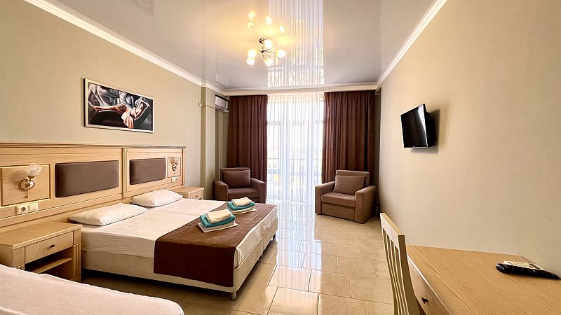 1 двуспальная кровать, 1 односпальная кровать, 1 кресло-кровать. Имеется телевизор, кондиционер, шкаф, вешалка, рабочий стол, холодильник, посуда, столовые приборы, стулья, фен. Индивидуальная ванная комната: душ, раковина, туалет.