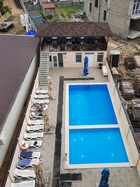 Во дворе гостиницы есть небольшой бассейн, разделенный на взрослую и детскую часть. Есть небольшая детская площадка и отличная беседка для вечерних посиделок- это очень круто, там можно было сидеть со своей едой столько сколько нам угодно+ гостиница предоставляла музыку.