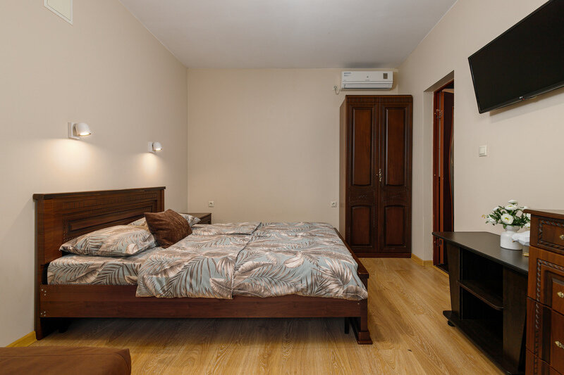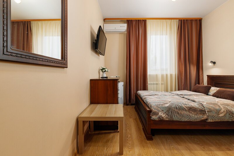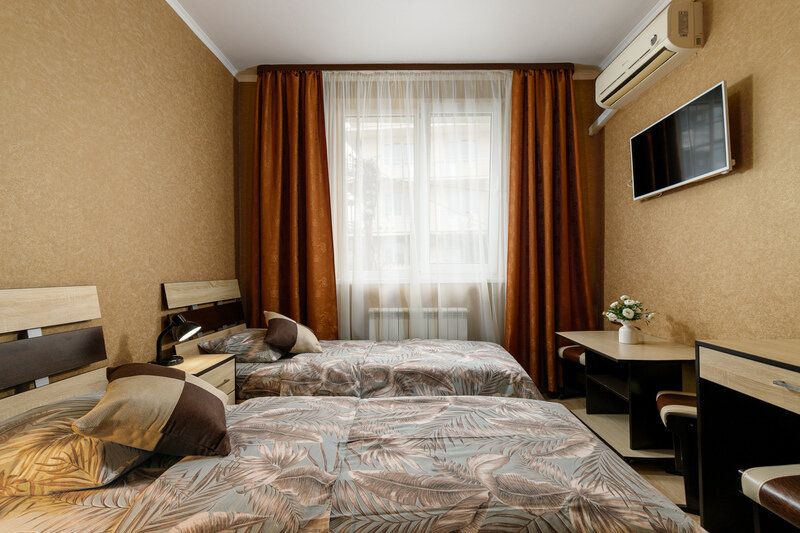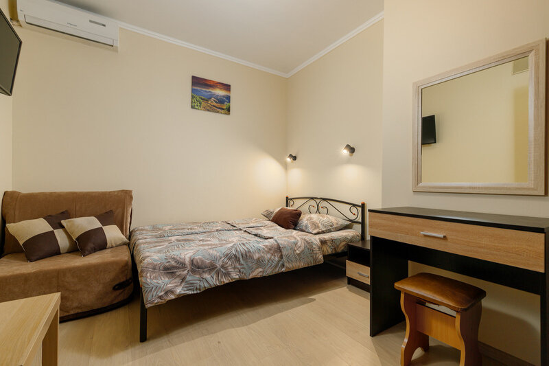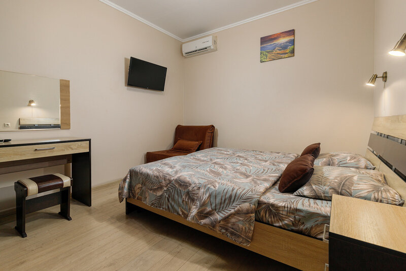 Отель находится в 7-9 минутах ходьбы от моря и в шаговой доступности от магазинов (большой магнит, пятерочка и много др..) и столовых. Также на территории отеля есть общая кухня , которая оборудована новой техникой: две газовые плиты , большой холодильник и есть вся необходимая посуда для приготовления еды. В зоне приема пищи работает кондиционер, все всегда было безупречно чисто. В номерах есть очень понятный в эксплуатации кондиционер, электрический чайник , маленький холодильник и большой плазменный телевизор.