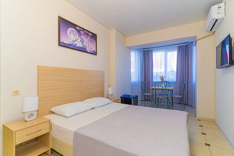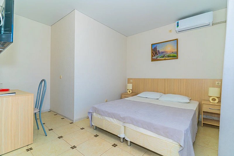 Номер с отдельным входом, площадью 18 м². В номере - 2 отдельные кровати или одна двуспальная кровать, кондиционер, шкаф, телевизор, мини холодильник, зеркало. В номере также есть собственный сан. узел с душевой кабинкой. В стоимость номера входит бесплатное пользование Wi-Fi.
