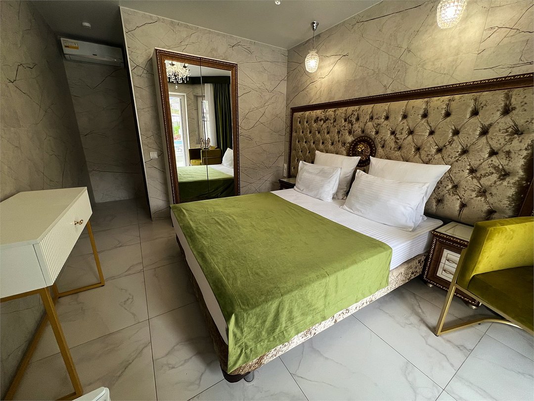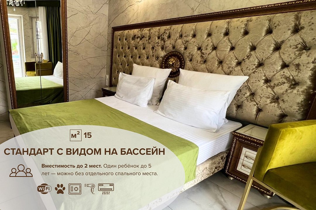 Оптимальный номер для 1 гостя или пары. Собственная ванная комната с душем, сккоростной интернет Wi Fi, система климат-контроля, кровать размера кинг сайз и рабочее место. Вид на бассейн. Стиль исполнения номеров: салатовый и бежевый.Услуги и удобства