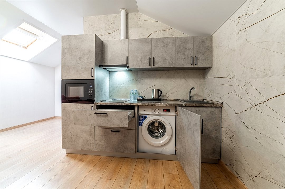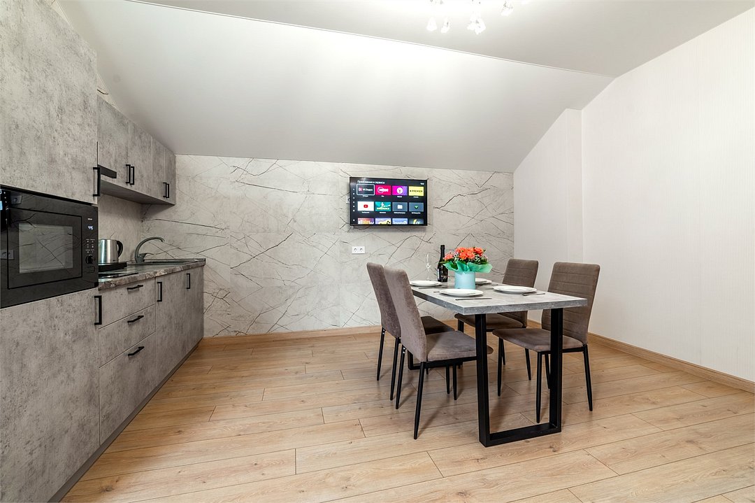 Самый просторный и комфортабельный номер для всей семьи. Вместимость до 6 человек. Оборудованная кухня с необходимой посудой. 2 раздельные комнаты с панорамными и мансардными окнами. Великолепные видовые характеристики с 4 этажа.Услуги и удобства