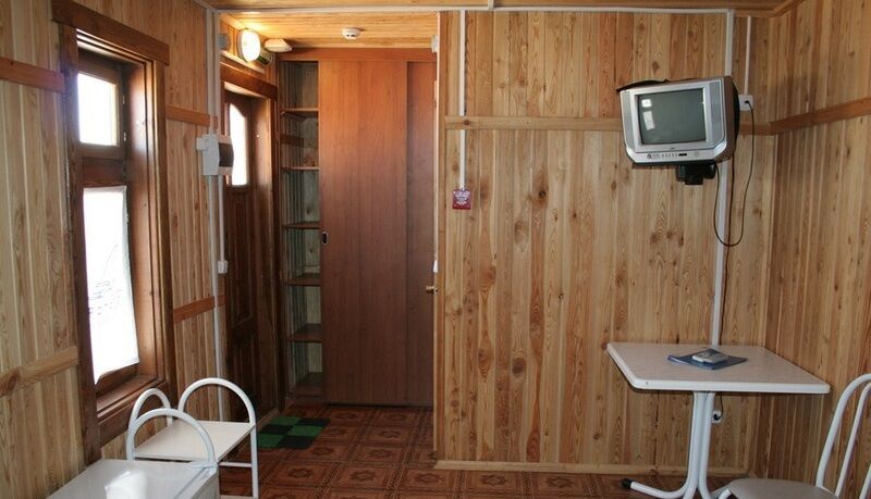 Кондиционером, телевизором, холодильником. Санузел совмещен с душем, горячая и холодная вода постоянно. Домик оборудован затененной хранилкой для матчасти.