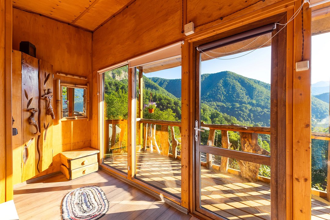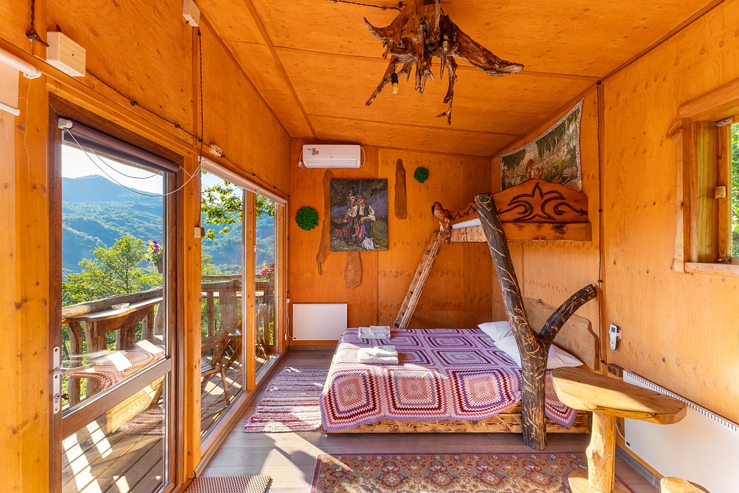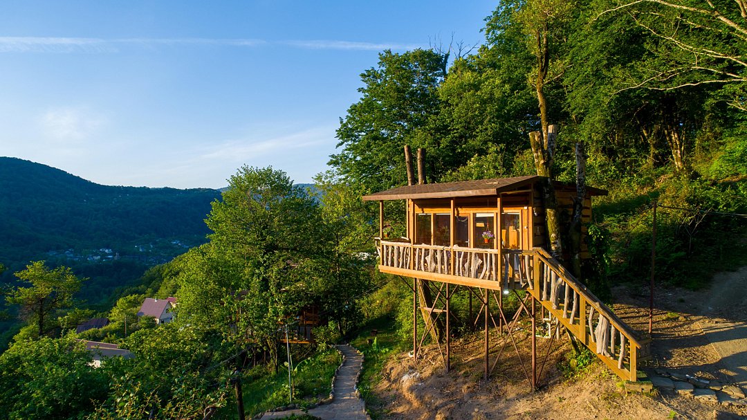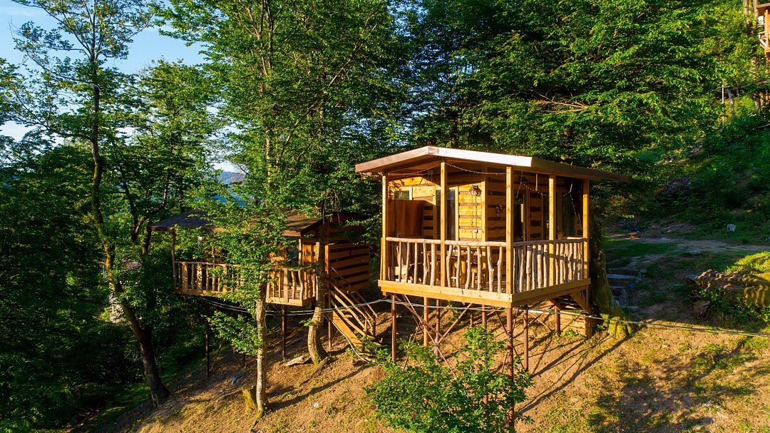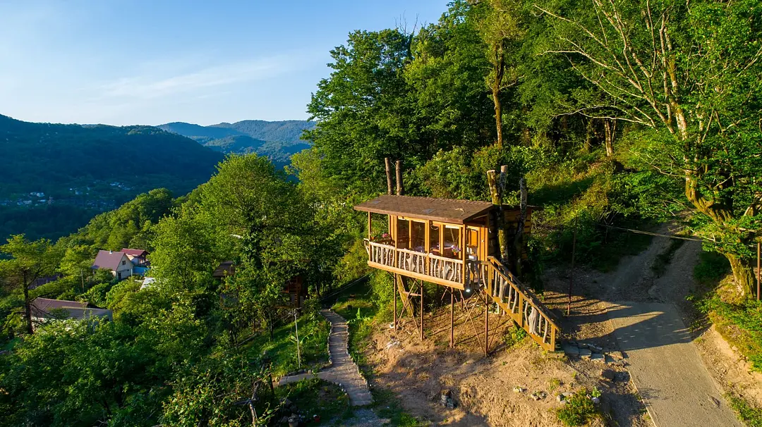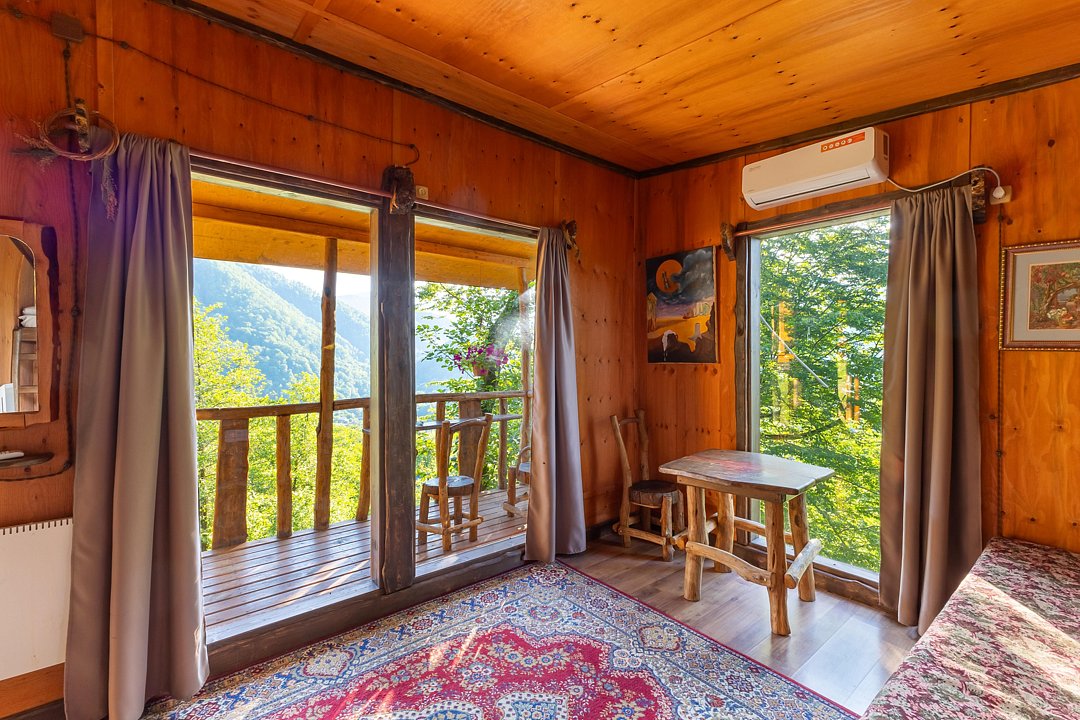 Просторный дом на дереве для семьи или компании друзей. Панорамное остекление позволит вам наслаждаться потрясающими видами на Кавказские горы в окружении девственных лесов.