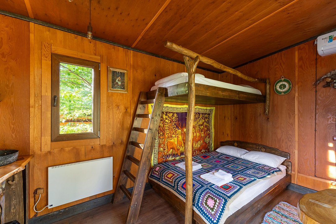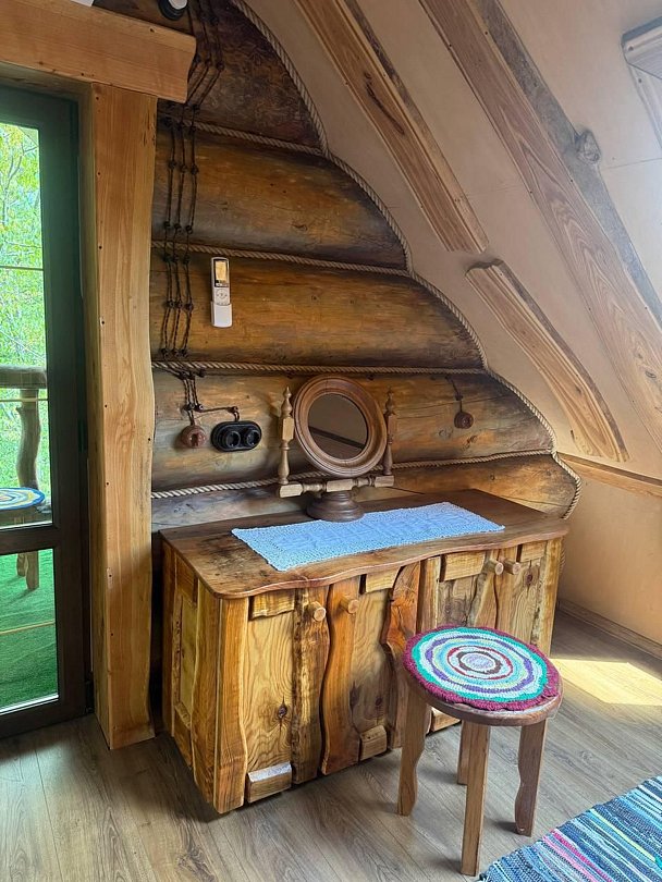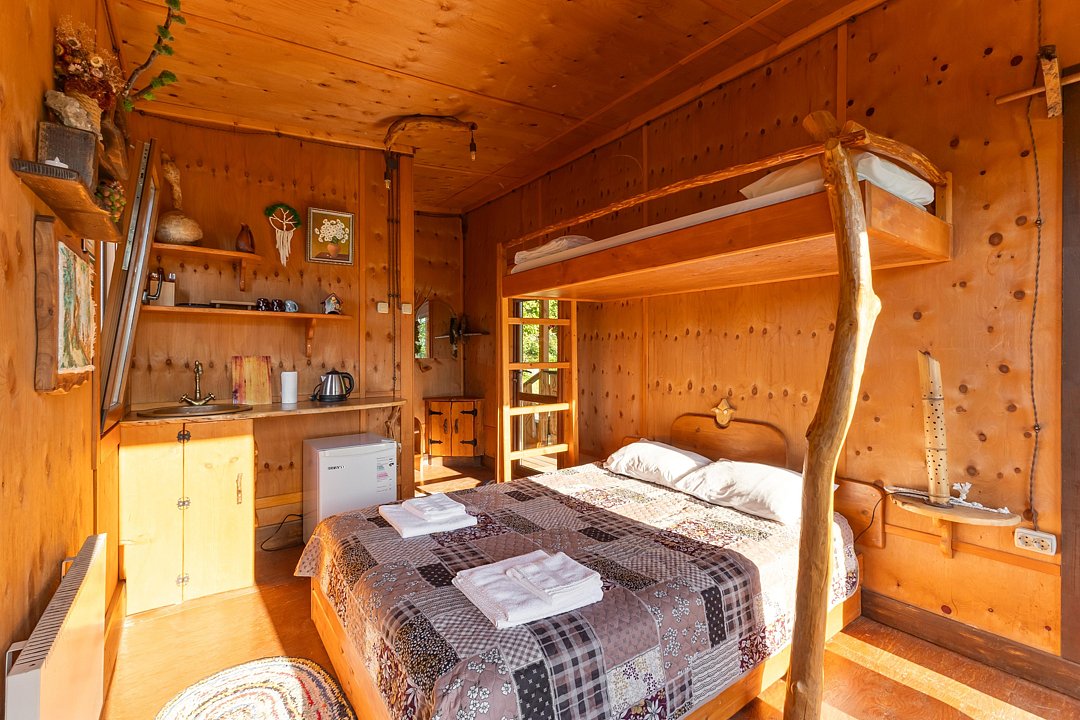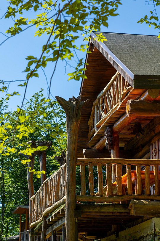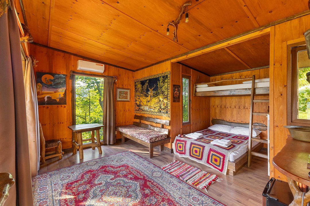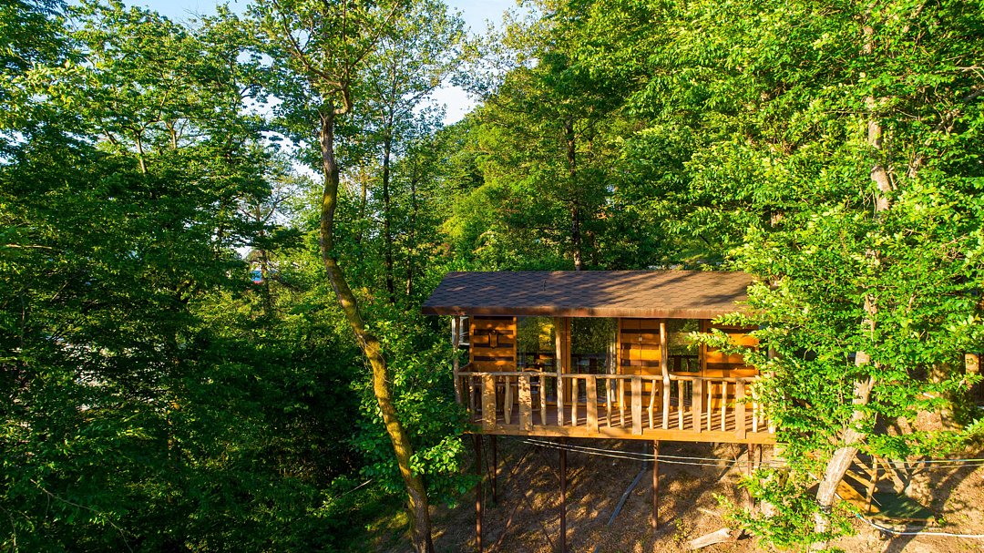 Просторный дом на дереве для семьи или компании друзей. Панорамное остекление позволит вам наслаждаться потрясающими видами на Кавказские горы в окружении девственных лесов.