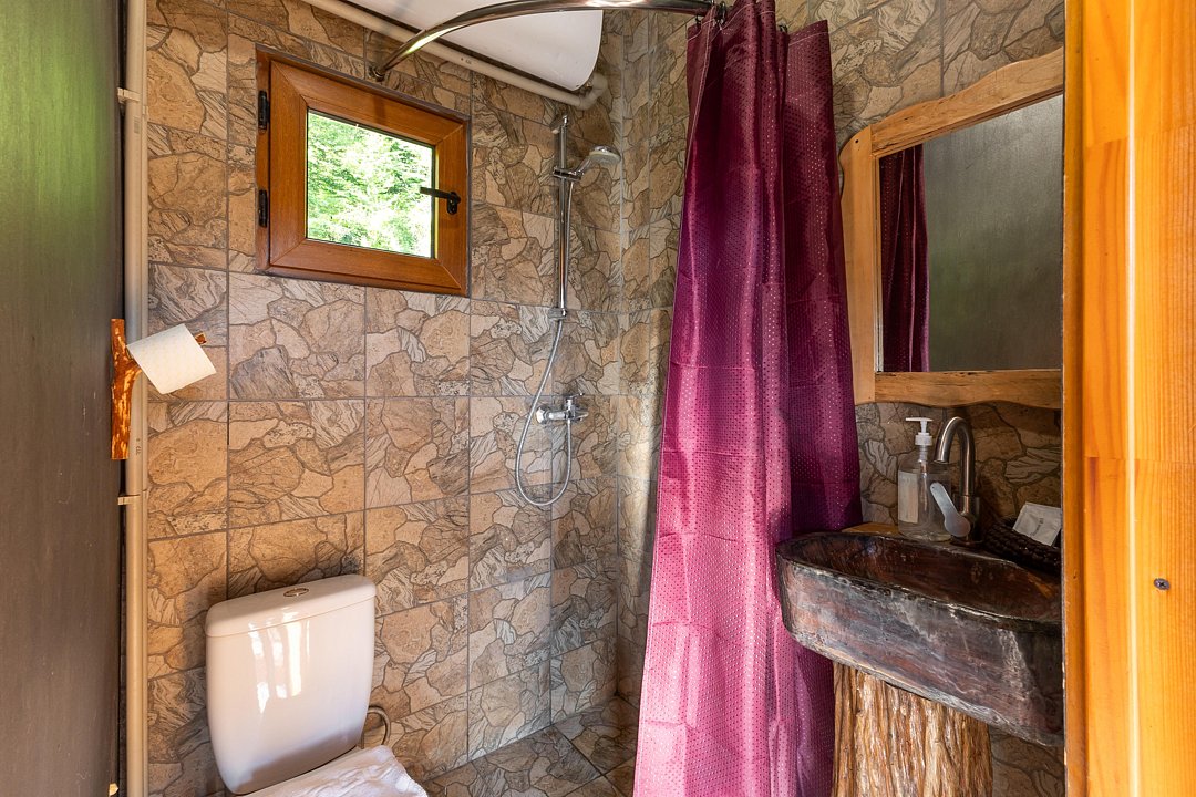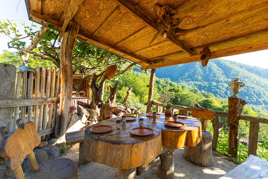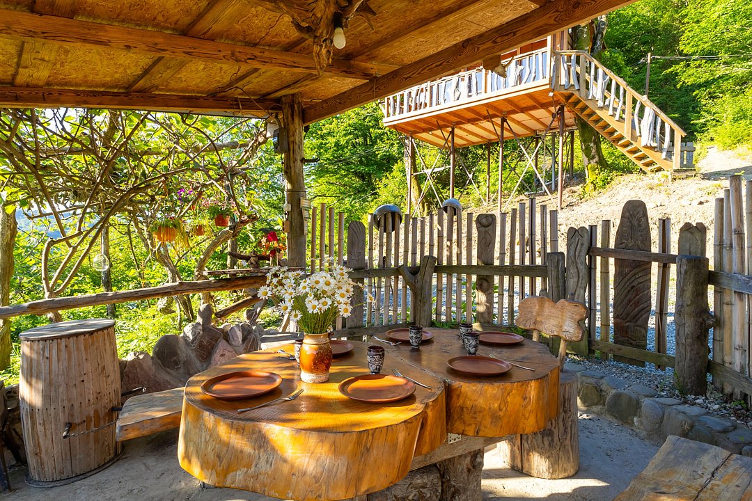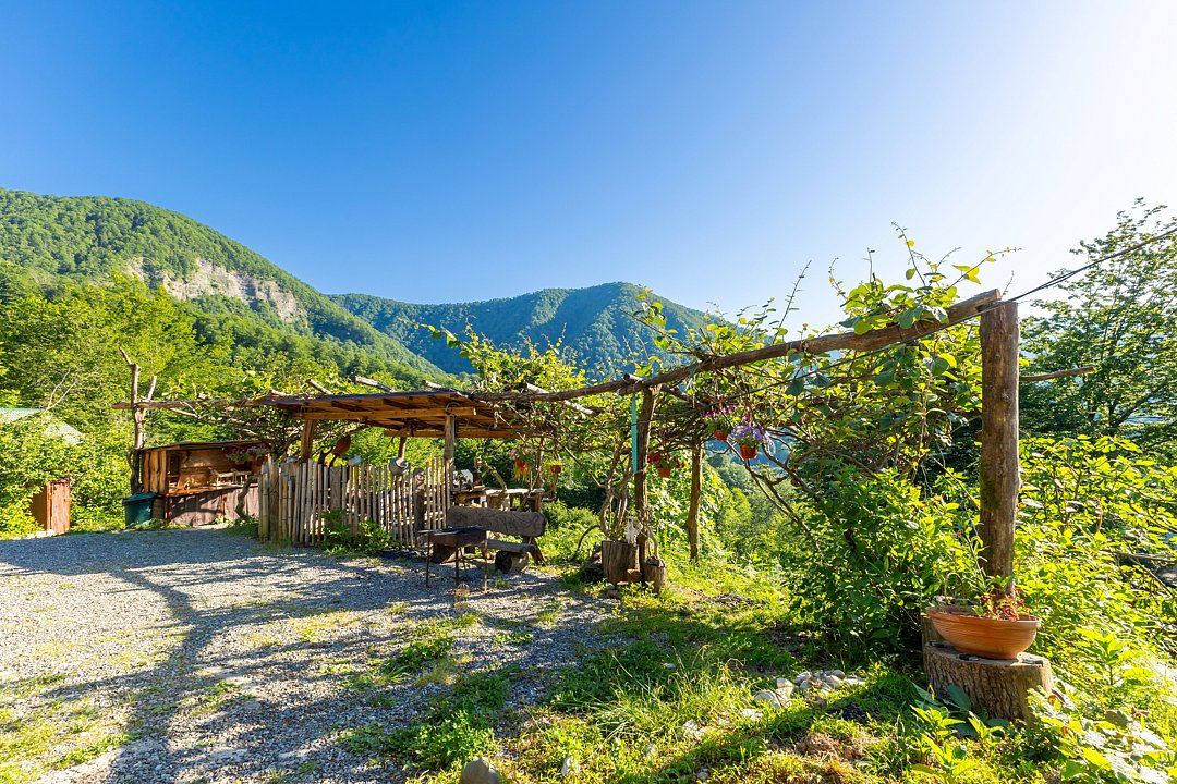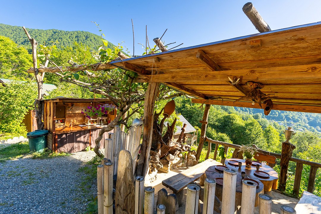 Усадьба представляет собой комплекс комфортабельных домиков–глэмпингов и беседок с вкуснейшей освежающей родниковой водой и завораживающими видами на горную цепь и ущелье с рекой Сочинка.