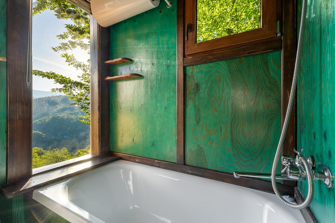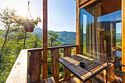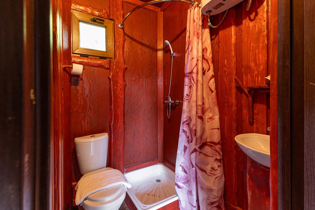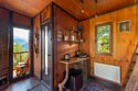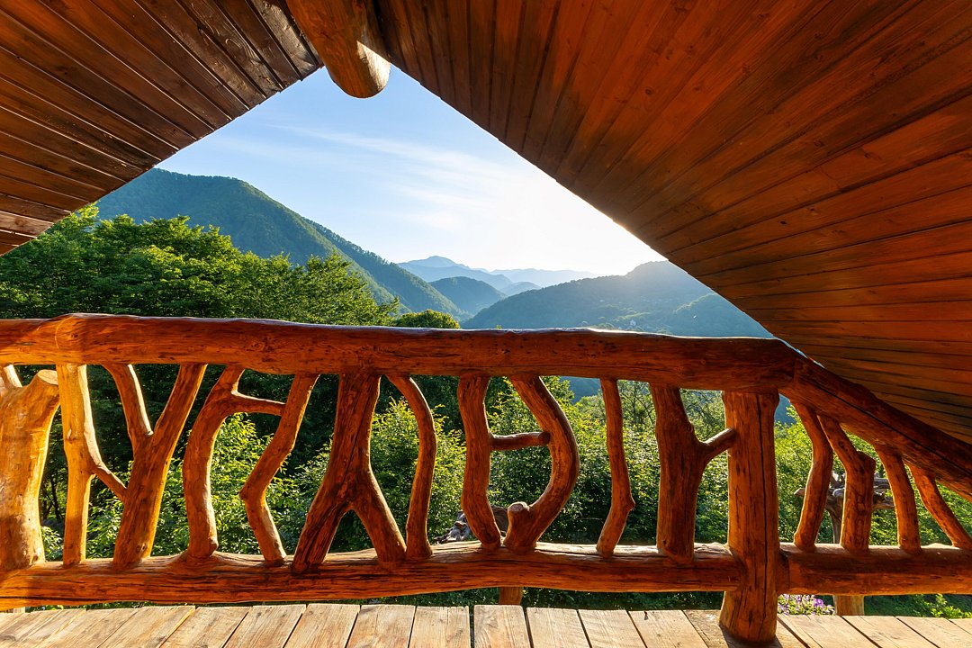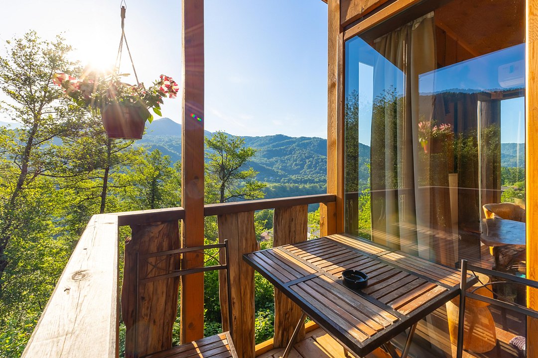 Самый высокий домик с панорамными окнами и шикарным видом на Кавказские горы. На террасе дома расположена барная стойка, где вы можете насладиться утренним кофе или вечерним бокалов вина, любуясь потрясающим видом на горы.