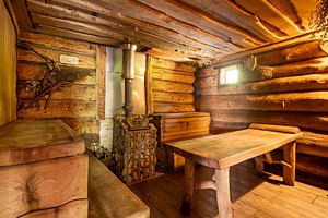 Это большой деревянный сруб из отборной древесины. Она легко нагревается и прекрасно удерживает высокую температуру, раскрывая природный аромат дерева. После жаркого парения окунитесь в ледяную родниковую воду в купели, глубиной 1,8 метра. До 8 человек.