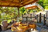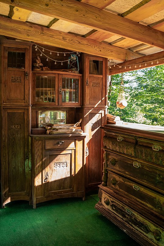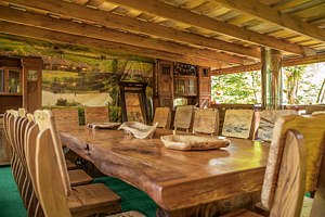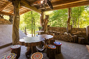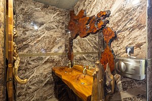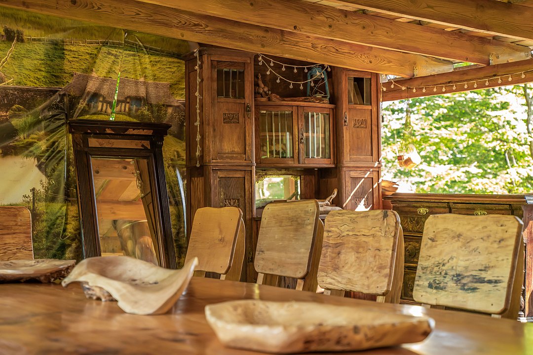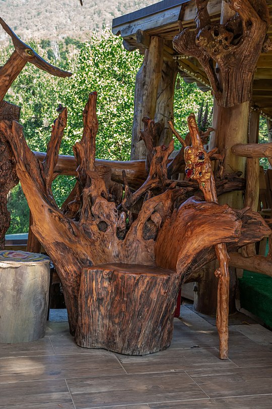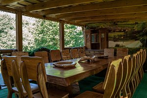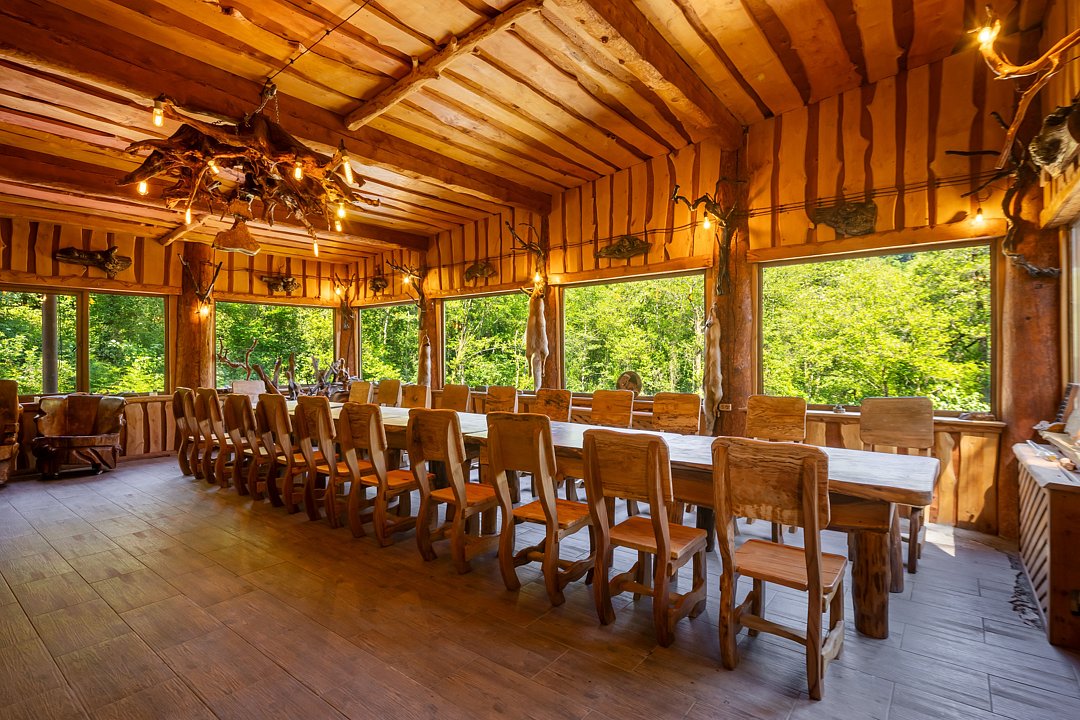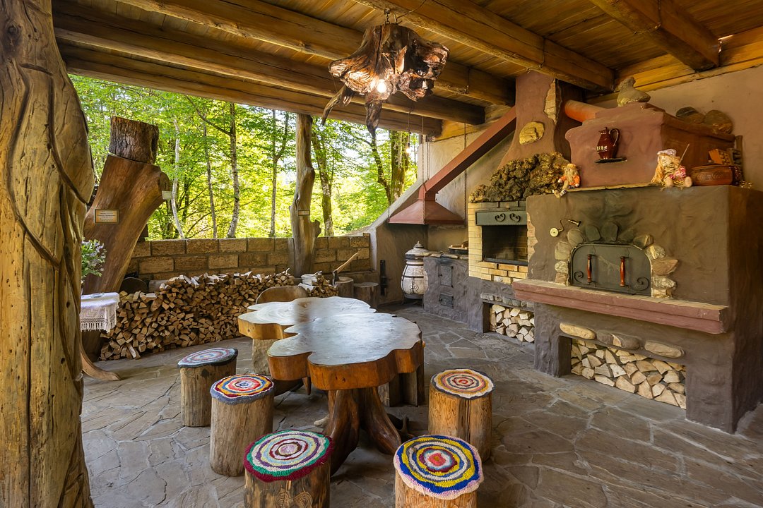 Интерьер усадьбы отличен эксклюзивной мебелью ручной работы из натурального дерева и искусственного камня, с использованием художественно обработанных корней и капы.