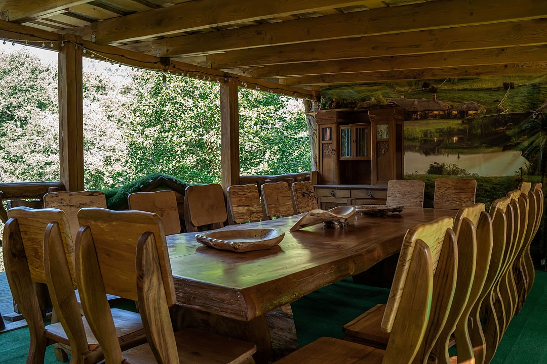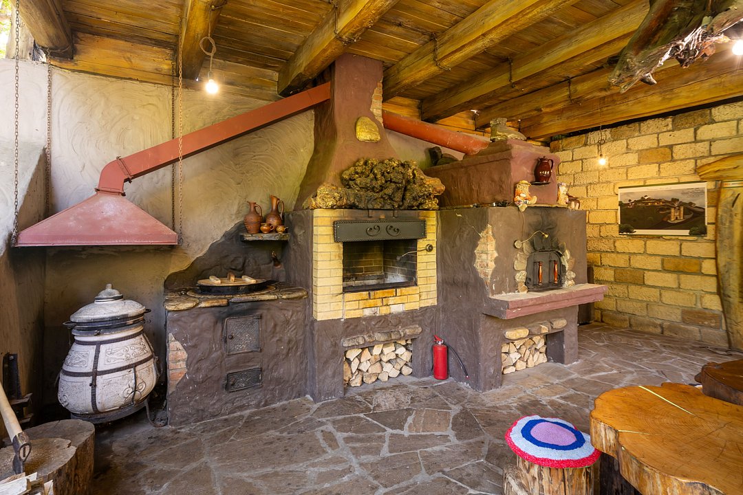 Уютная зона, которая оборудована всем необходимым для приготовления блюд на огне. Здесь есть мангал, большой казан, тандыр и настоящая русская печь на дровах. Приглашайте родных, друзей или коллег, чтобы приятно провести время. За столом ручной работы, выполненным из натурального дерева, комфортно разместятся 10 гостей. Время аренды с 11:00 до 23:00.