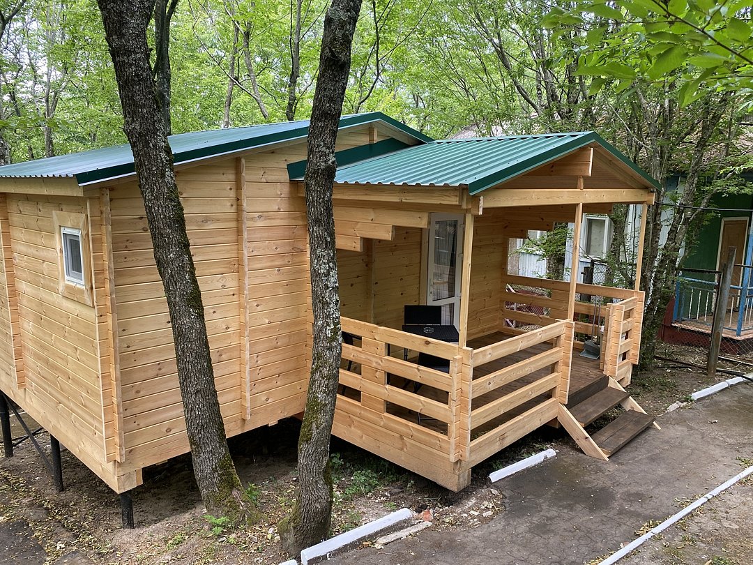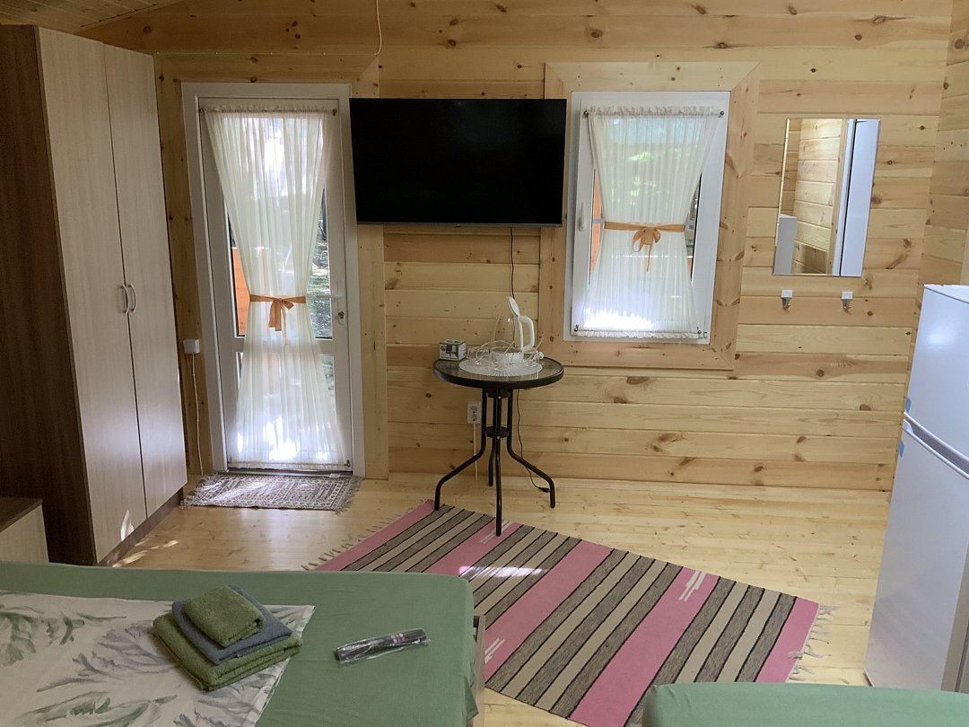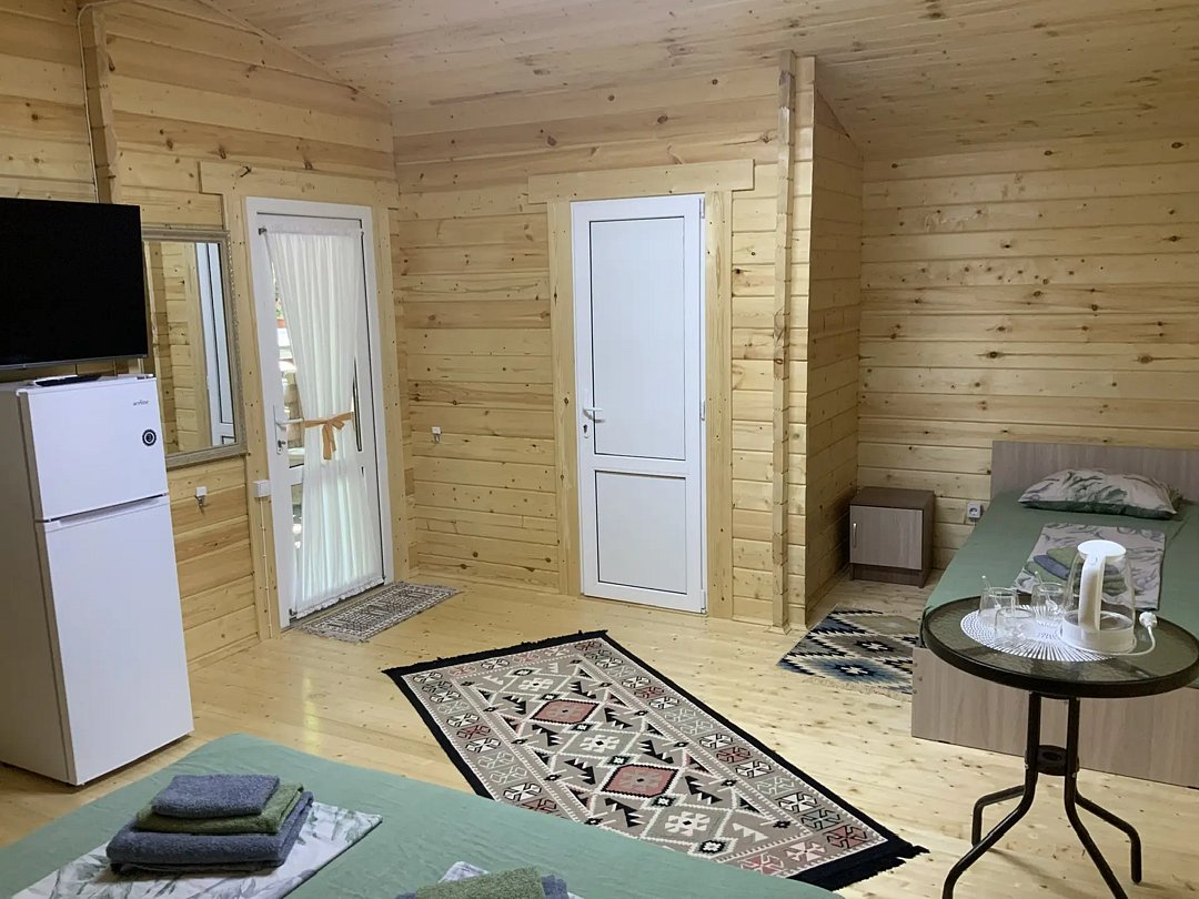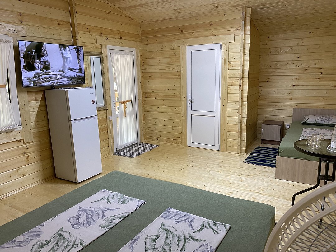 Уютный ЭКО-домик Премиум Комфорта с собственным санузлом и террасой. Удобная двуспальная кровать. Отдельная односпальная кровать. Прикроватные тумбочки. Шкаф для вещей. Современный телевизор. Стильный кофейный столик. Холодильник. Электрический чайник с набором чашечек. Просторная душевая кабина с тропическим душем. Унитаз. Раковина. Полотенце банное для лица, для рукю Климат контроль сплит система.