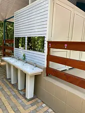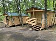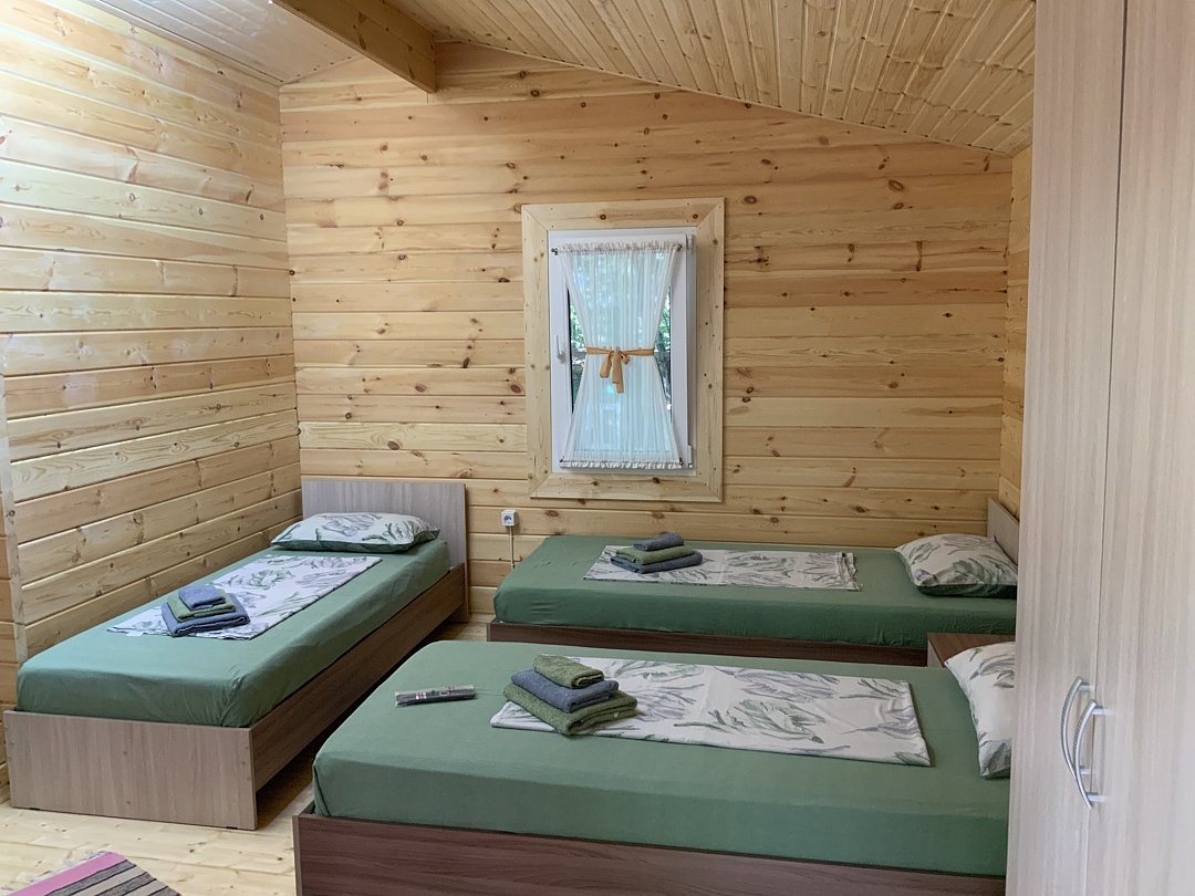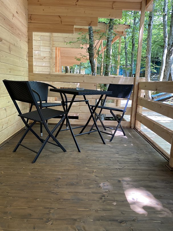 Уютный ЭКО-домик Премиум Комфорта с собственным санузлом и террасой. Три отдельные односпальные кровати. Прикроватные тумбочки. Шкаф для вещей. Современный телевизор. Стильный кофейный столик. Холодильник. Электрический чайник с набором чашечек. Просторная душевая кабина с тропическим душем. Унитаз. Раковина. Полотенце банное для лица, для рук. Климат контроль сплит система.