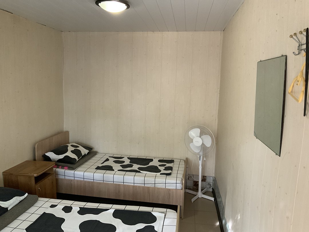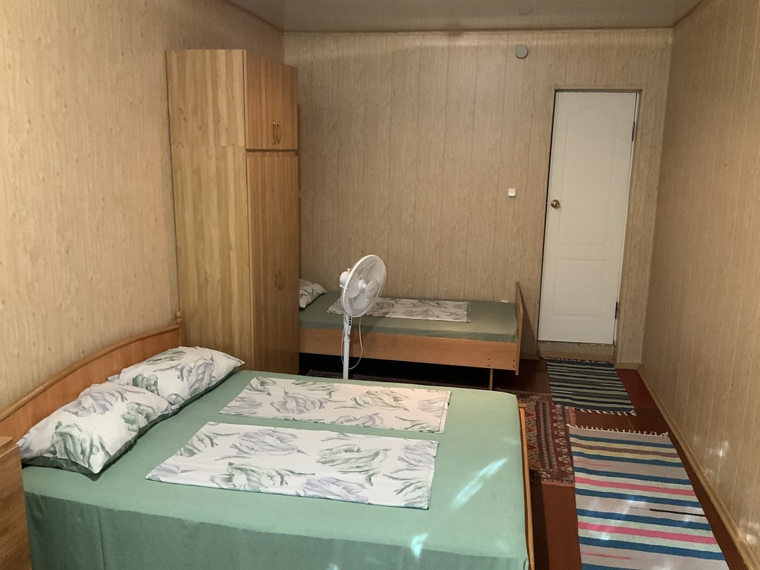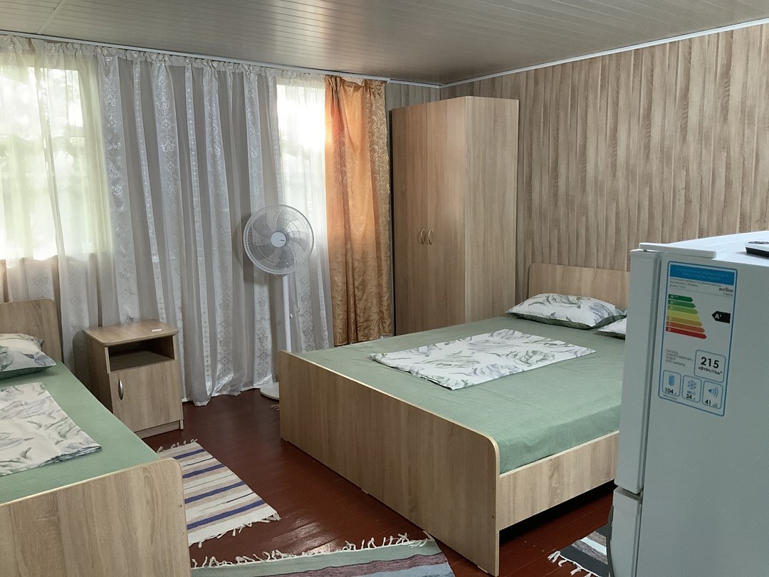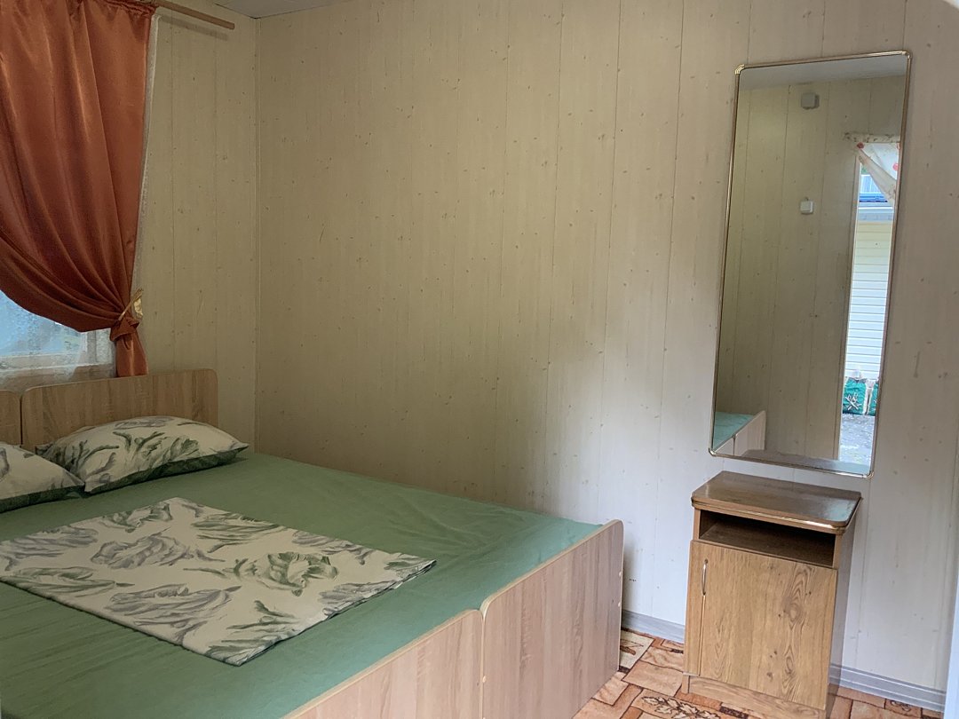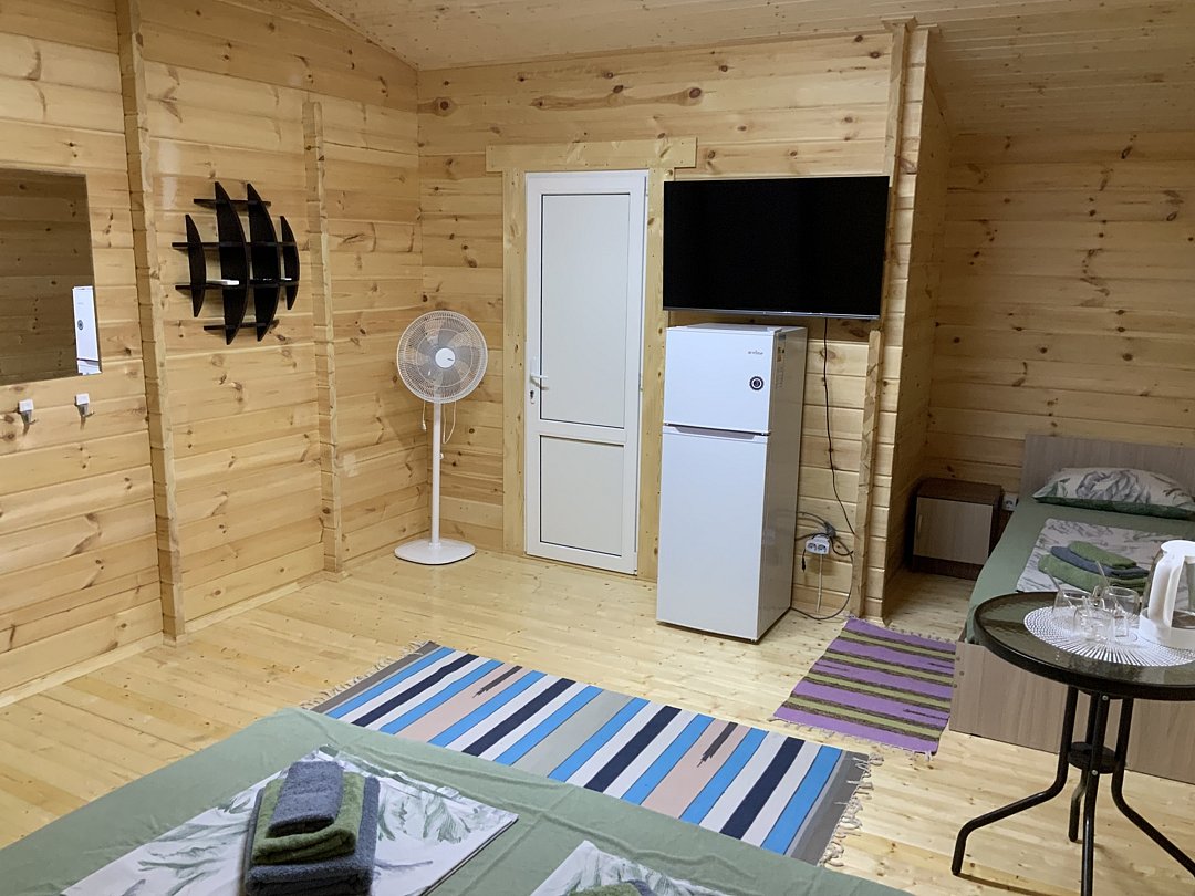 Все продуманно для проживания небольшой семьи, ничего лишнего. Комфортная двуспальная кровать и отдельная односпальная кровать. Прикроватные тумбочки. Освежающий вентилятор. Холодильник. Практичный столик, стулья. Собственная небольшая терраса.