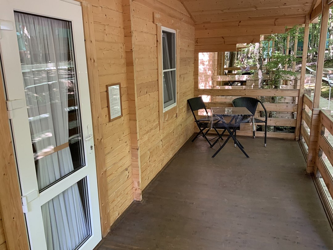 Все продумано для проживания небольшой семьи, ничего лишнего: прикроватные тумбочки, освежающий вентилятор, холодильник, практичный столик, стулья, собственная небольшая терраса.