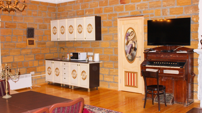 - кухня с холодильником, микроволновой печью, посудой, чайником, телевизором, сплит-системой;
