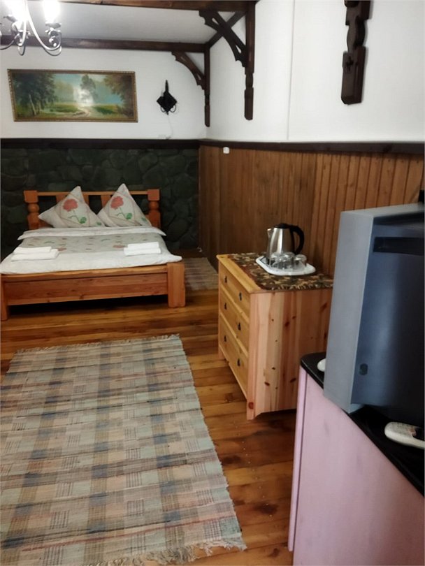 В номере двуспальная кровать, тумбочка, вешалка для одежды, чайный столик, стулья, телевизор, мини-холодильник, сплит-система.