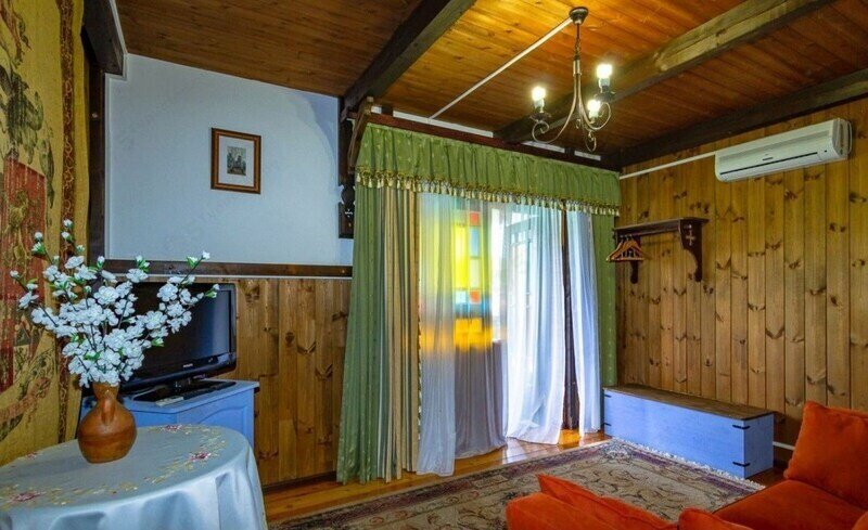 В номере двуспальная кровать, двуспальный раскладной диван, тумбочка, вешалка для одежды, чайный столик, стулья, телевизор, мини-холодильник, сплит-система.