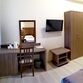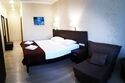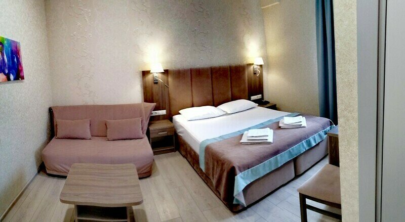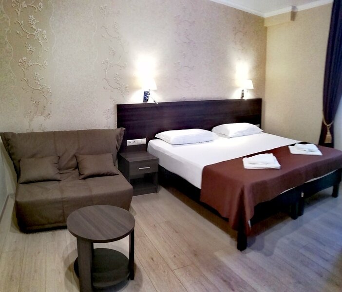 Двухместный номер с одной большой кроватью или двумя односпальными кроватями и односпальным раскладным диваном, прихожая, шкаф, стол, стул, прикроватные тумбочки, журнальный столик, зеркало, телевизор, мини-холодильник, кондиционер, сушилка для белья.