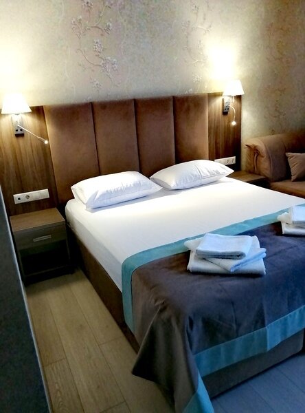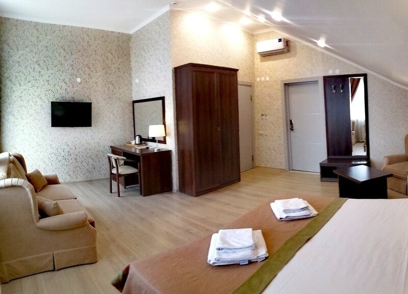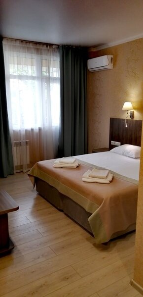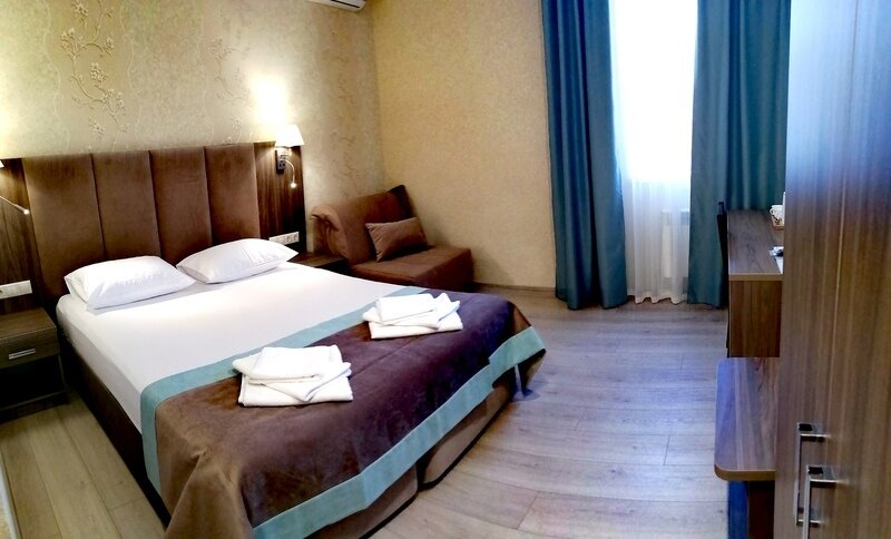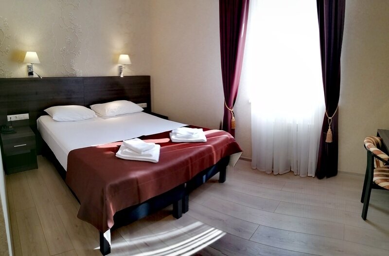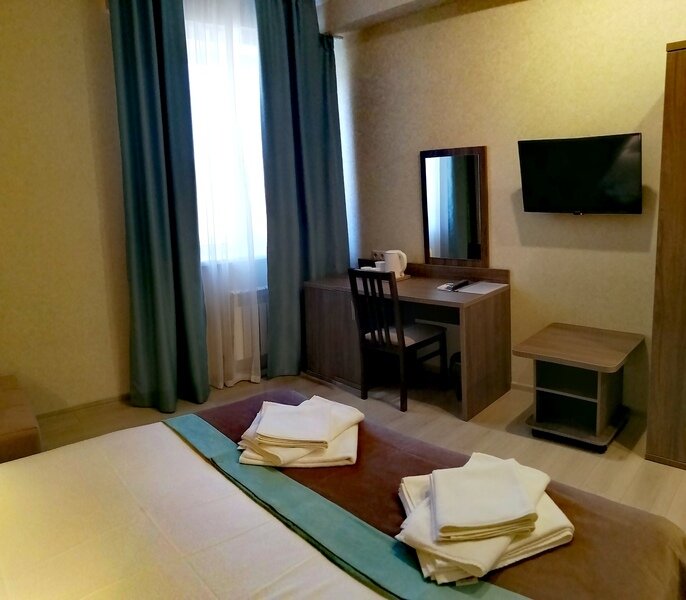 Двухместный номер с одной большой кроватью или двумя односпальными кроватями. В номере есть всё необходимое для комфортного проживания одного или двух гостей: прихожая, шкаф, стол, стул, прикроватные тумбочки, журнальный столик, зеркало, телевизор.
