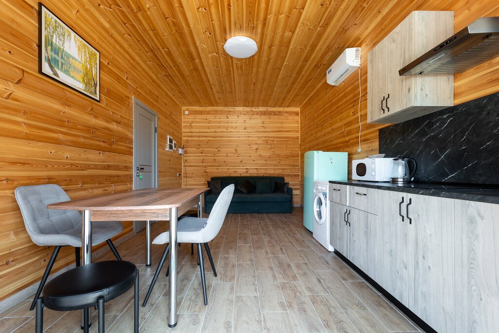 - основной холл, где расположена обеденная зона при кухне. На весь дом имеется стиральная машина, большой холодильник с морозильной камерой, там же расположен диван раскладной.