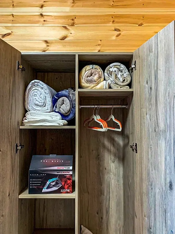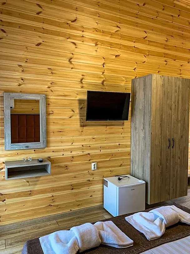В номере мини-холодильник, чайник, чашки, стаканы и стопочки, фен, сплит-система, шкаф, тумбочки, стол, телевизор, гладильная доска, утюг.