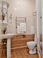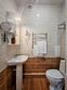 Ванная комната с душевой кабиной, раковиной и унитазом.