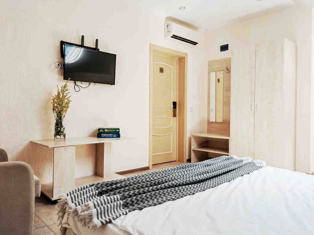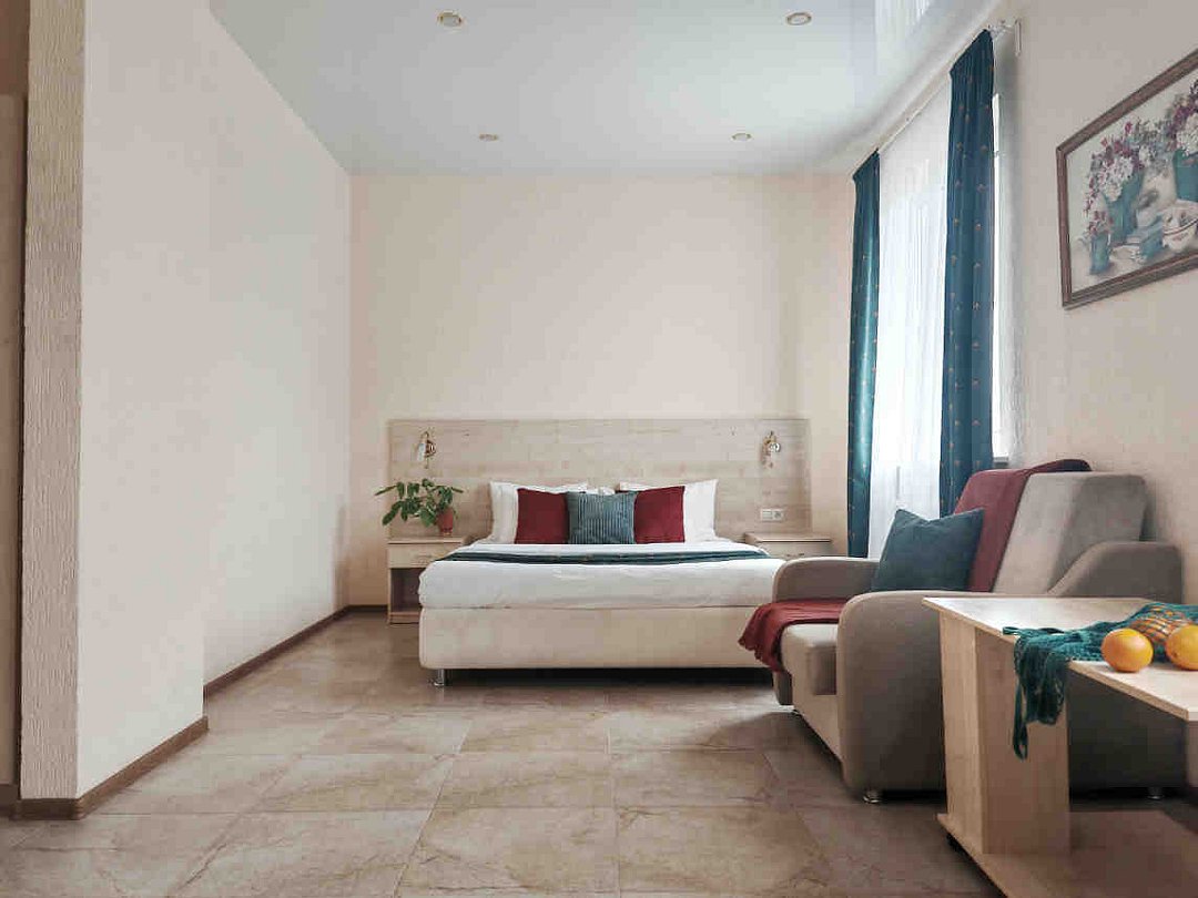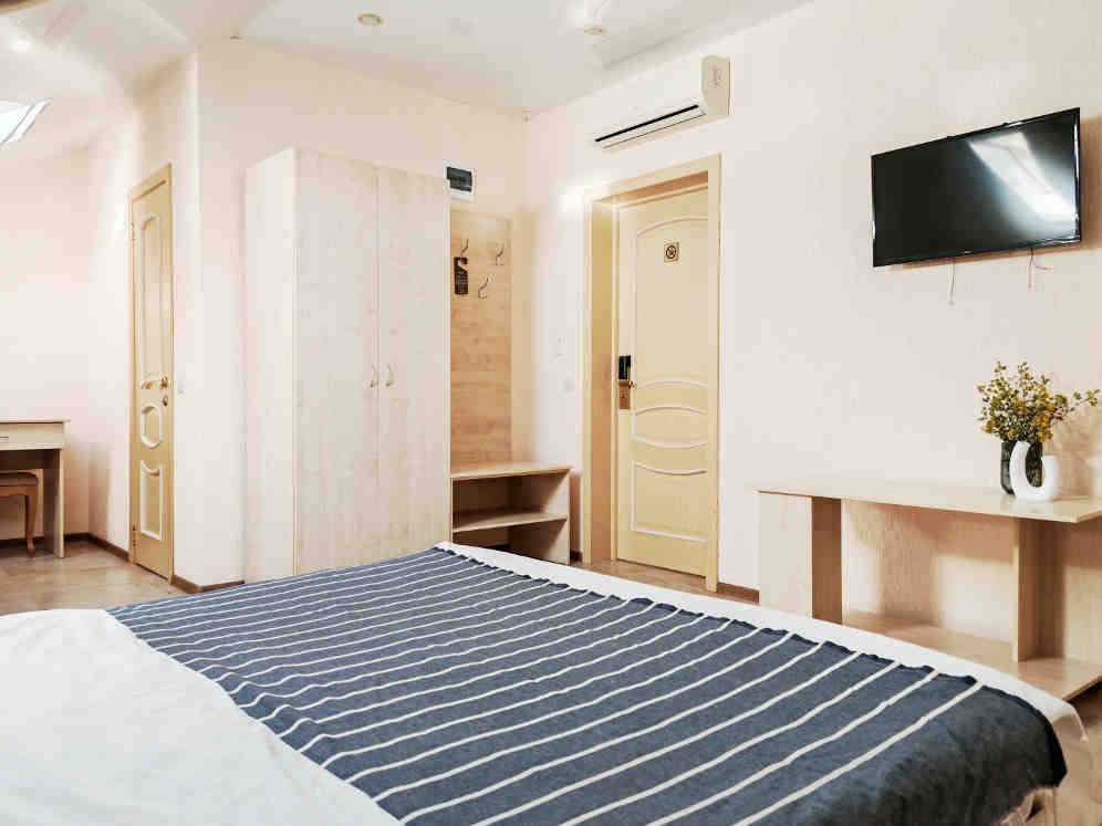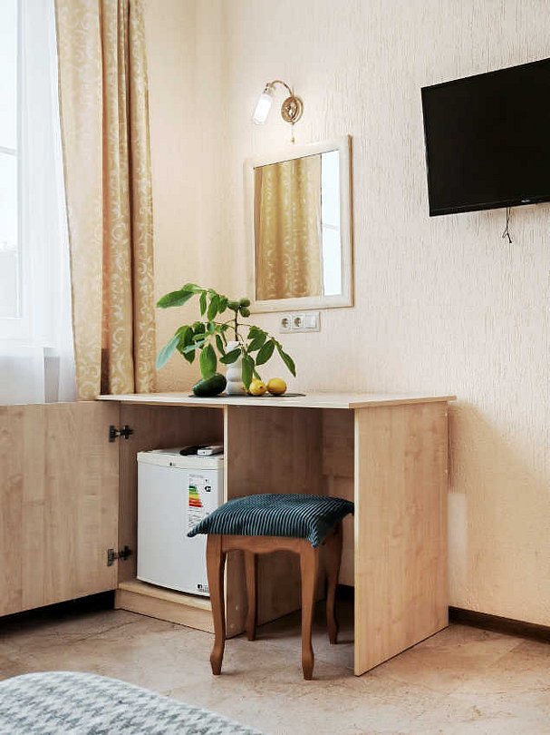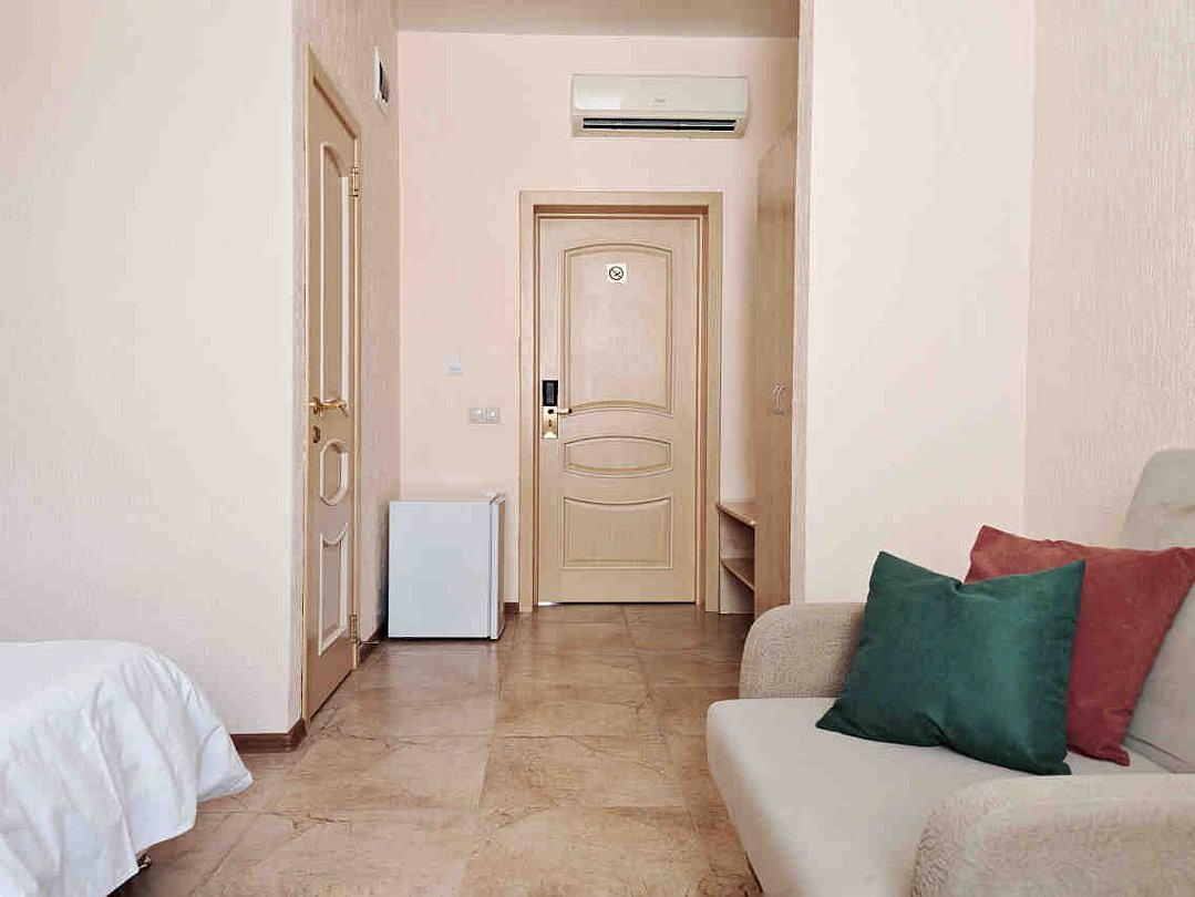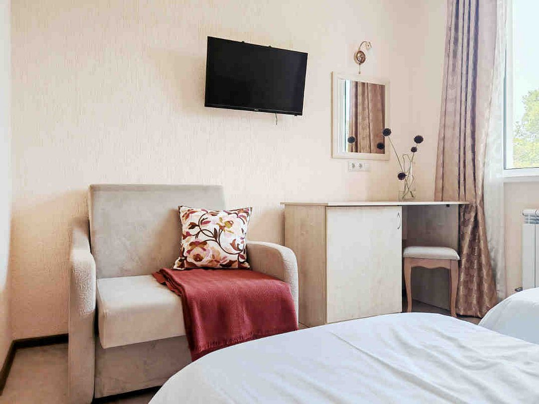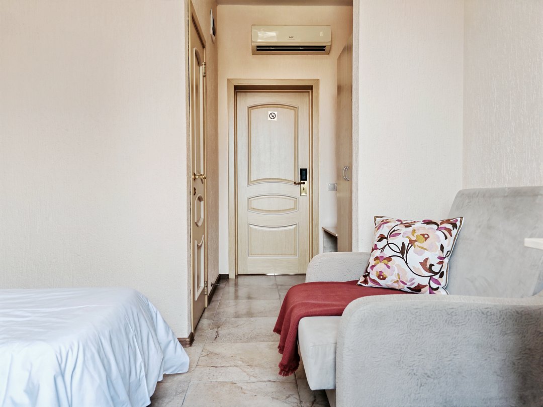 Номер тихий и уютный, с одной двуспальной кроватью или двумя односпальными кроватями. В номере также есть удобное кресло-кровать, прикроватные тумбы, туалетный столик, пуфик, шкаф для одежды, мини-сейф, телевизор, сплит-система, мини-холодильник, москитные сетки на окнах. Ванная комната с душевой кабиной, унитазом, раковиной, феном, жидким мылом, туалетной бумагой и полотенцами для каждого гостя.