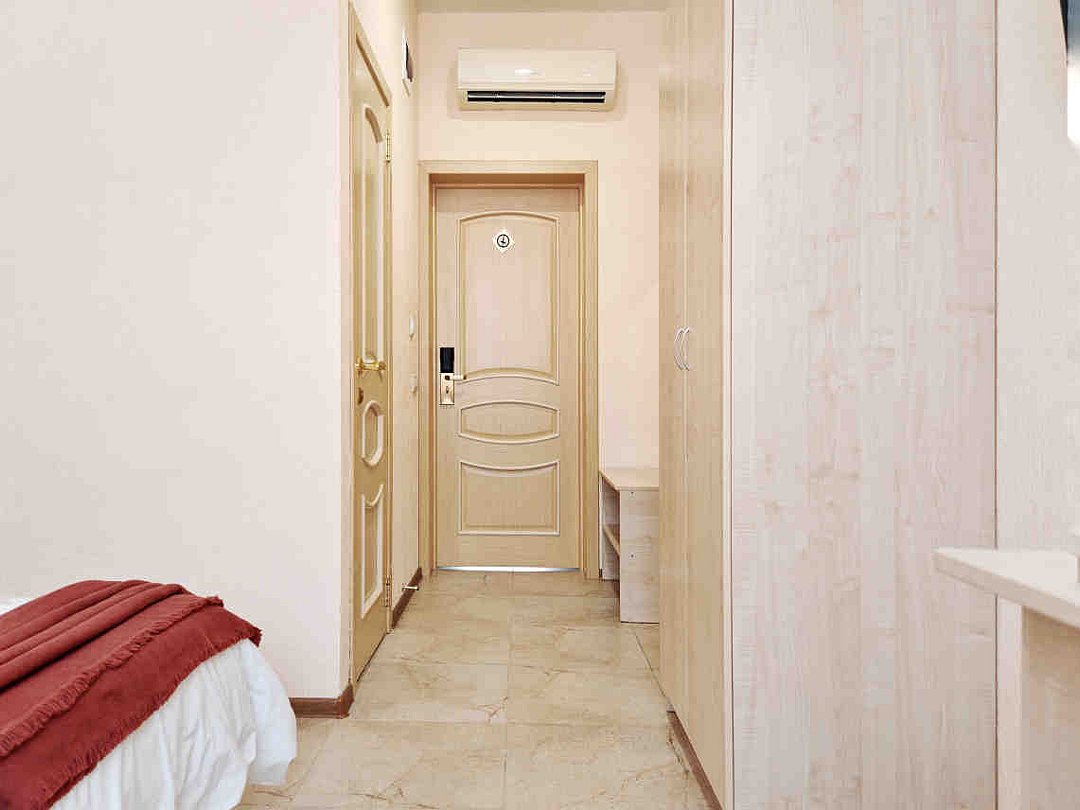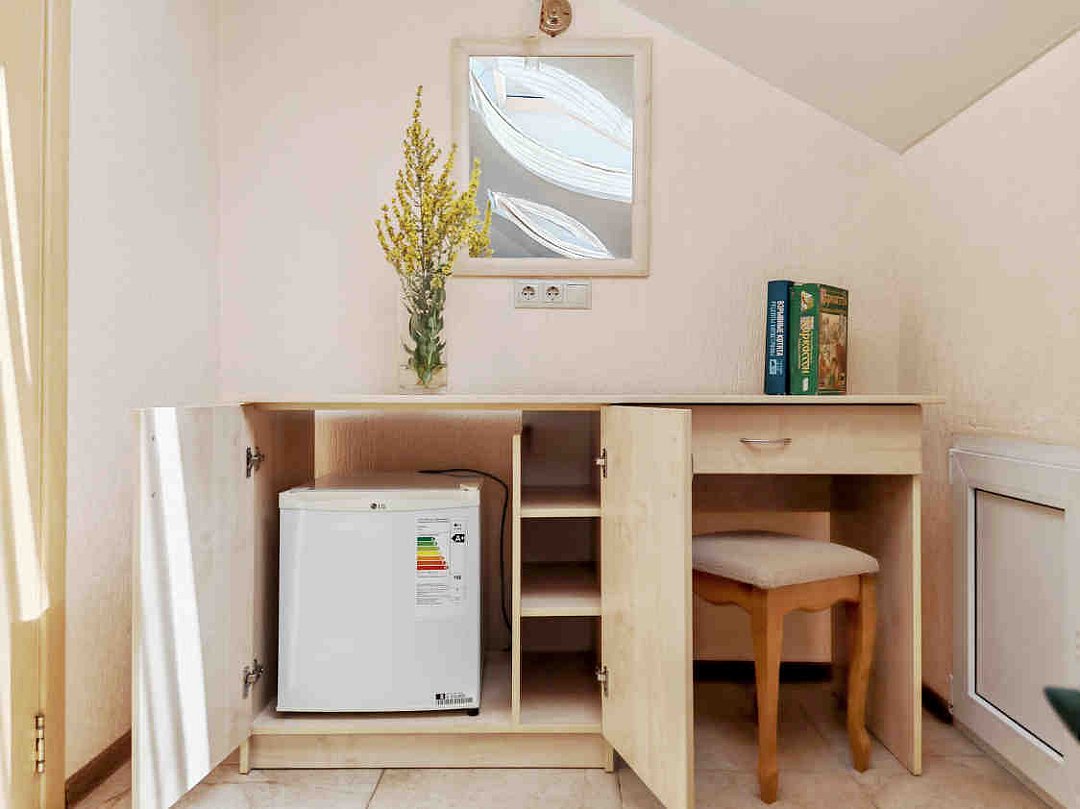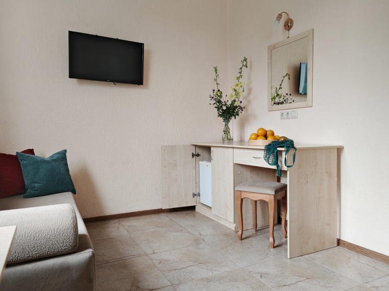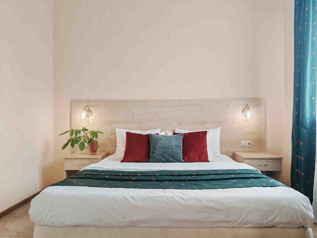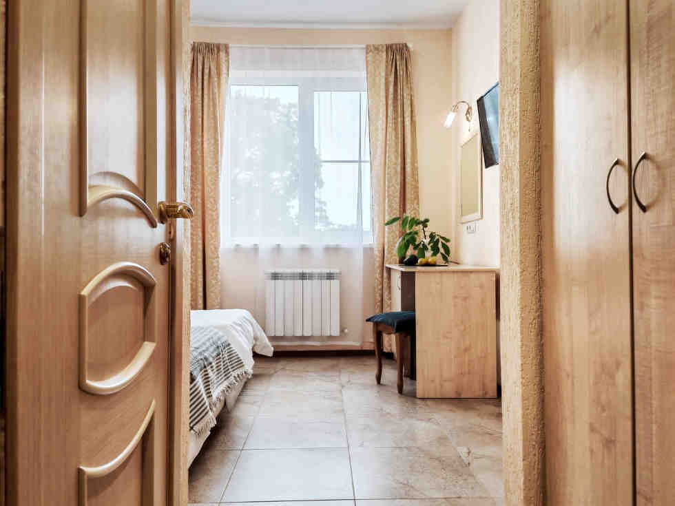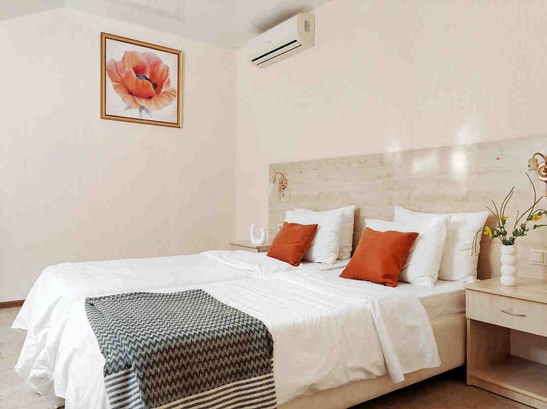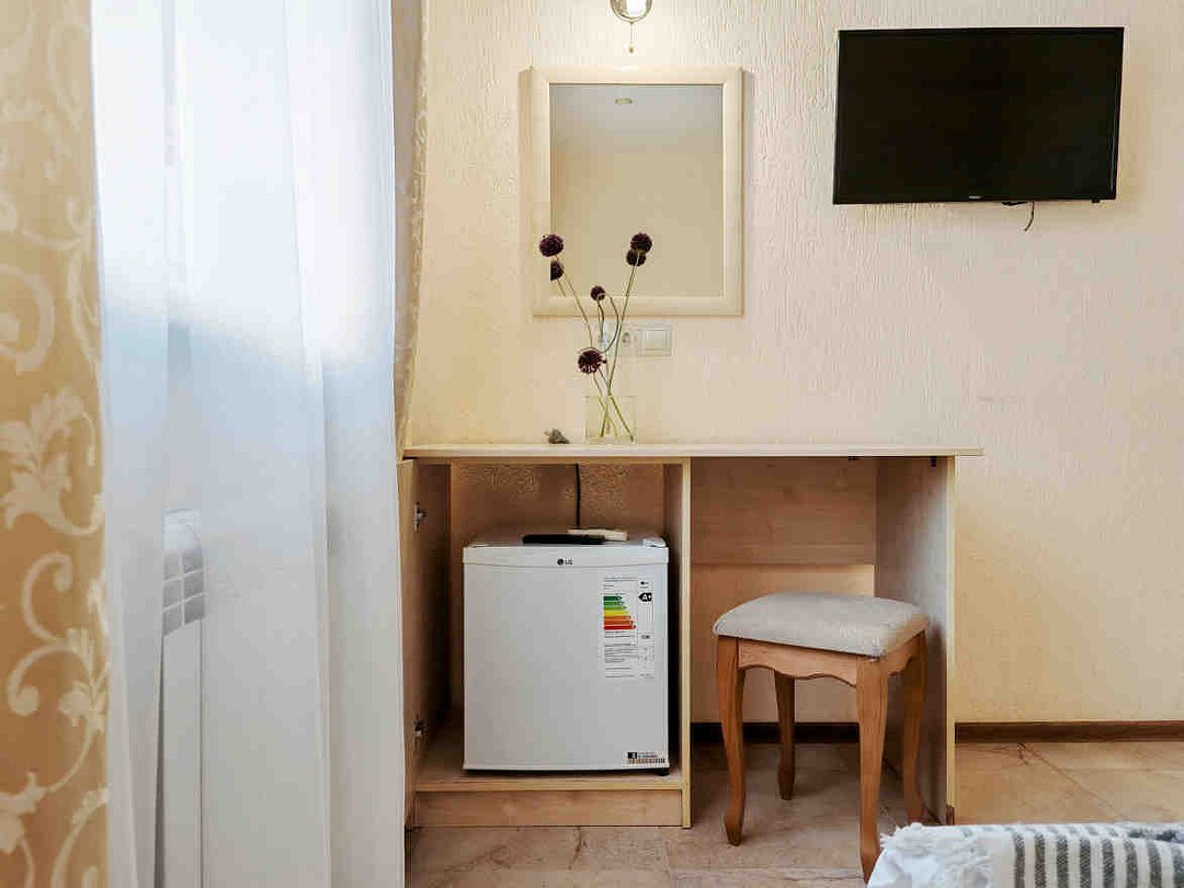 Номер тихий и уютный, с одной двуспальной кроватью или двумя односпальными кроватями. В номере также есть удобное кресло-кровать, прикроватные тумбы, туалетный столик, пуфик, шкаф для одежды, мини-сейф, телевизор, сплит-система, мини-холодильник, москитные сетки на окнах. Ванная комната с душевой кабиной, унитазом, раковиной, феном, жидким мылом, туалетной бумагой и полотенцами для каждого гостя.