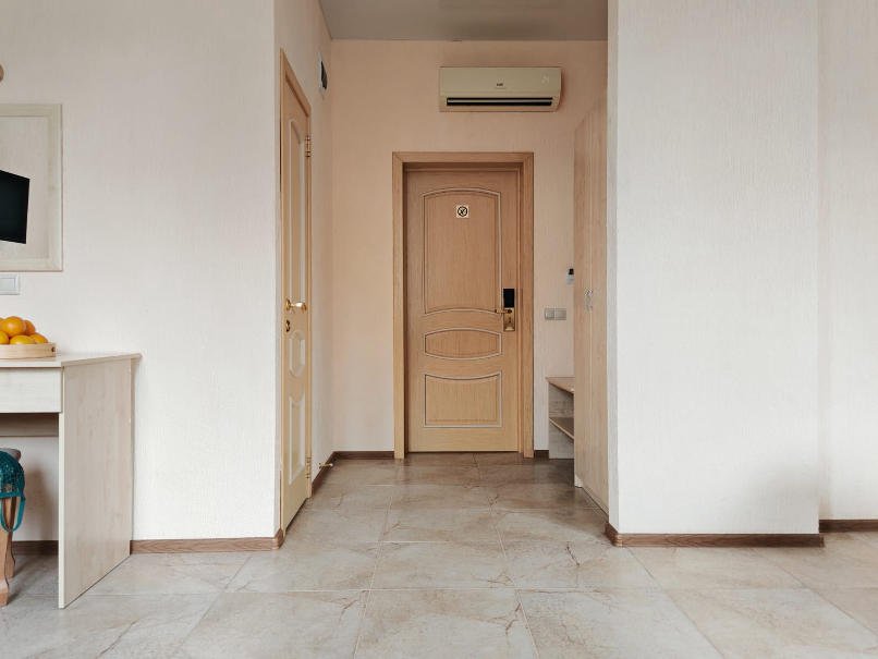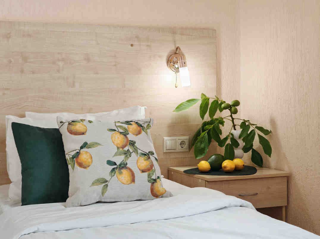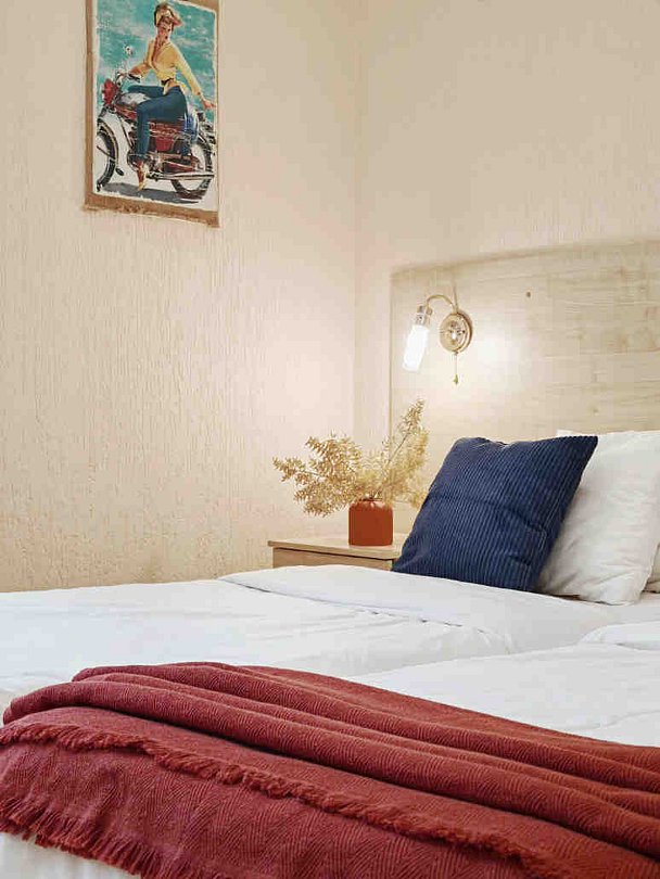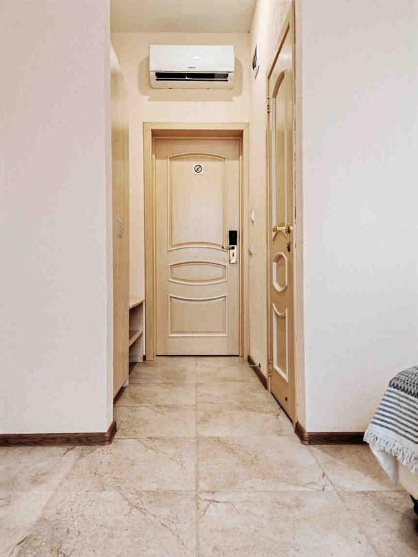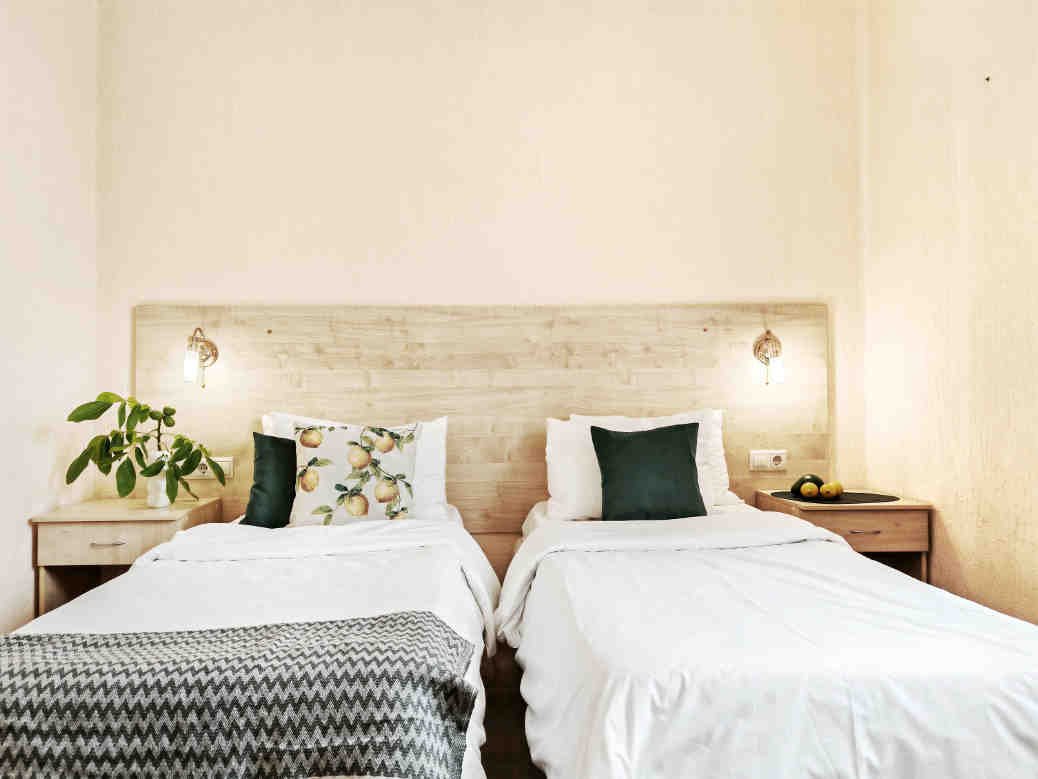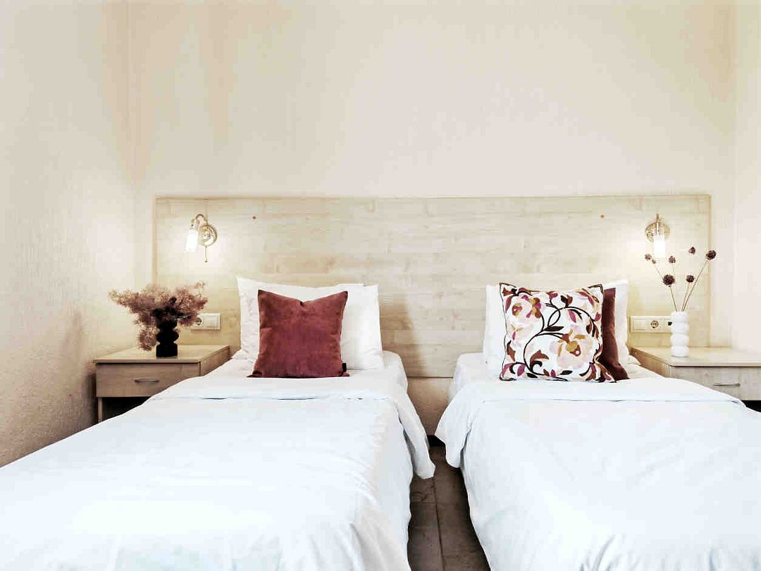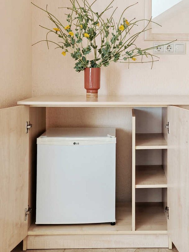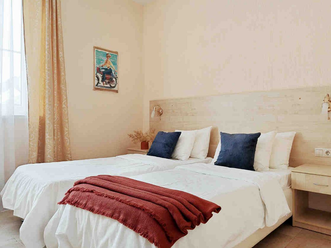 Номер тихий и уютный, с одной двуспальной кроватью или двумя односпальными кроватями. В номере также есть удобное кресло-кровать, прикроватные тумбы, туалетный столик, пуфик, шкаф для одежды, мини-сейф, телевизор, сплит-система, мини-холодильник, москитные сетки на окнах. Ванная комната с душевой кабиной, унитазом, раковиной, феном, жидким мылом, туалетной бумагой и полотенцами для каждого гостя.