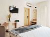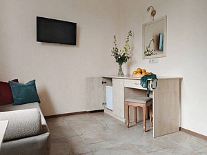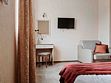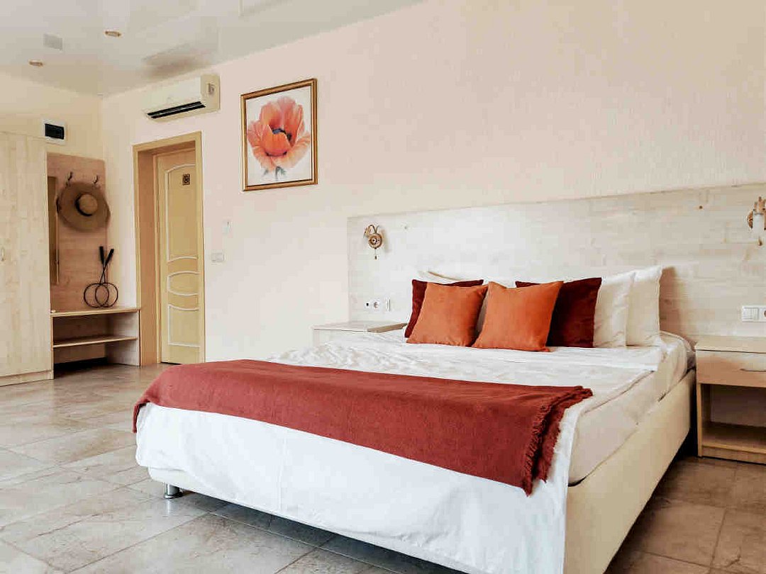 В номере также есть удобное кресло-кровать, прикроватные тумбы, туалетный столик, пуфик, шкаф для одежды, мини-сейф, телевизор, сплит-система, мини-холодильник, москитные сетки на окнах. Ванная комната с душевой кабиной, унитазом, раковиной, феном, жидким мылом, туалетной бумагой и полотенцами для каждого гостя. Балкона в номере нет. Окна номеров данной категории выходят на солнечную или теневую сторону. Цвета мебели и текстиля в номерах могут различаться. Обратите внимание, что курение в номерах запрещено. Во время проживания у вас есть возможность пользоваться подогреваемым бассейном, зоной для отдыха с шезлонгами и домашним кинотеатром. По предварительной договоренности может быть предоставлено парковочное место (кол-во мест ограничено).