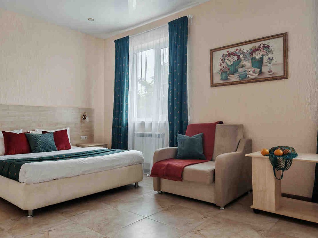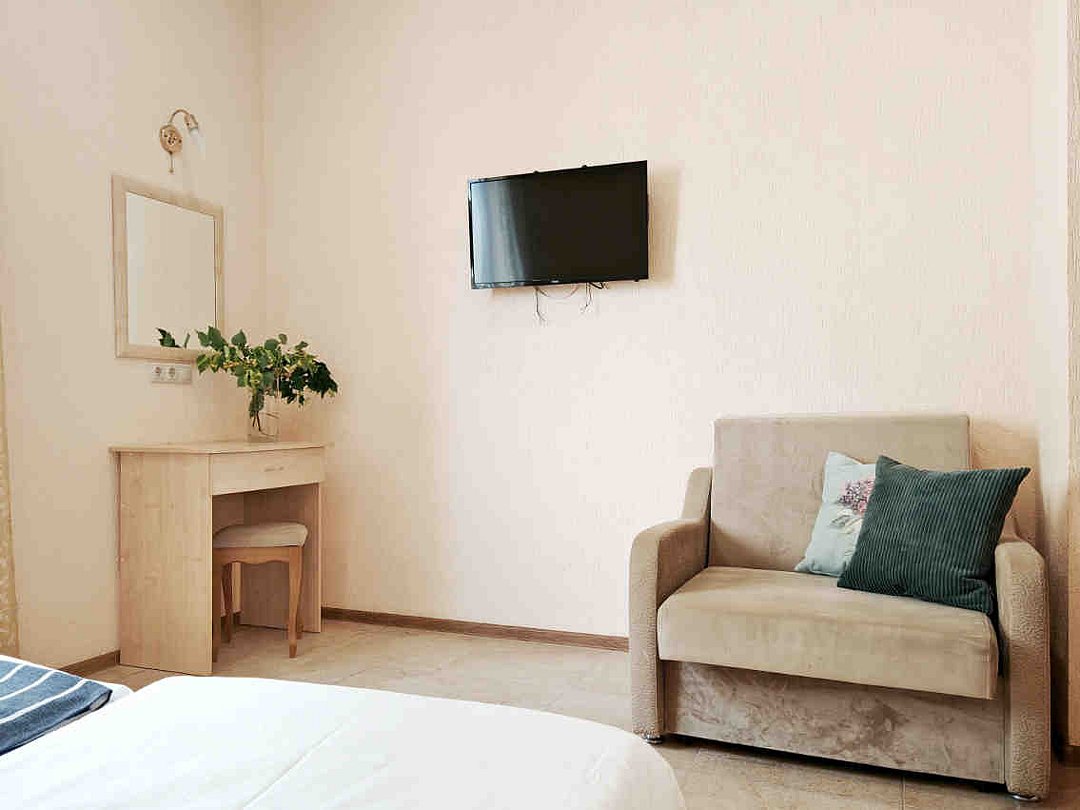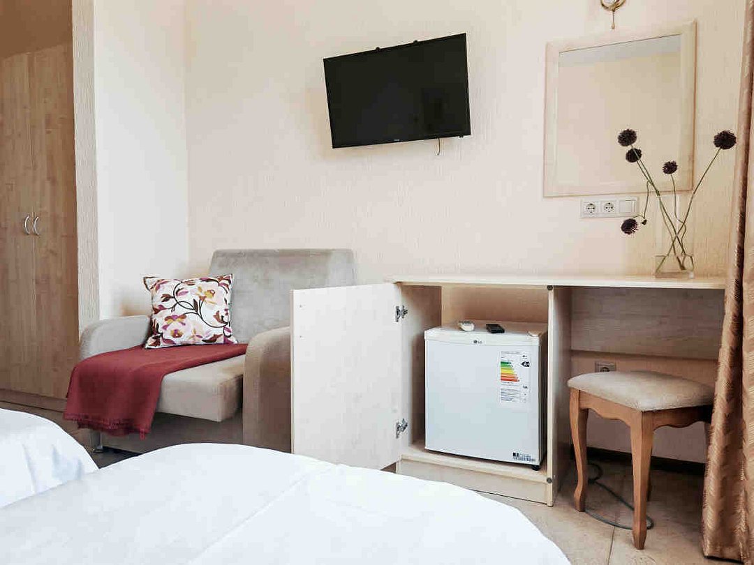 Трехэтажный корпус гостевого дома разместился на благоустроенной закрытой территории. Гостей ожидают двухместные номера разных категорий, включая бюджетные варианты в цокольном этаже. Комнаты Гостевого дома оформлены в классическом стиле и выдержаны в светлых бежевых тонах и оснащены современной техникой и необходимой мебелью. В комнатах: удобные спальные места, прикроватные тумбы, туалетный столик, пуфик, шкаф для одежды, мини-сейф, телевизор, сплит-система, мини-холодильник, москитные сетки на окнах. Ванная комната с душевой кабиной, унитазом, раковиной, феном, жидким мылом, туалетной бумагой и полотенцами для каждого гостя. Дети до 2-х лет размещаются бесплатно без предоставления места, на кровати с родителями.