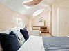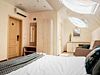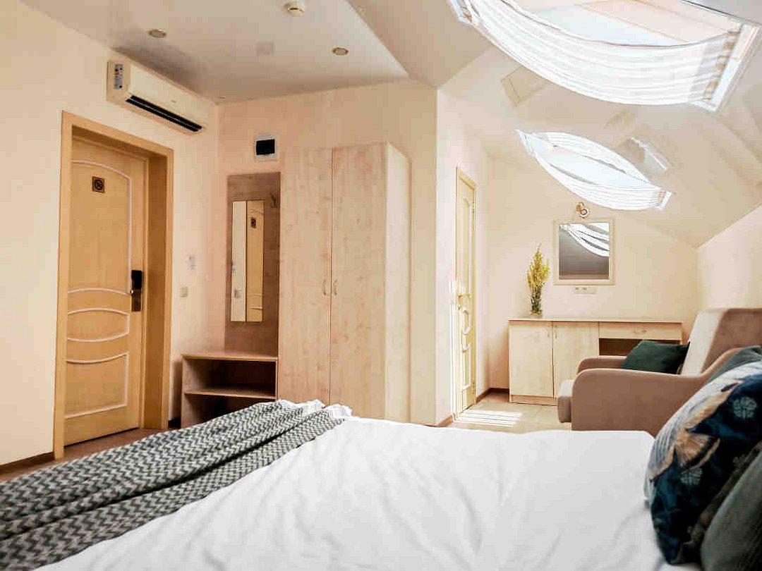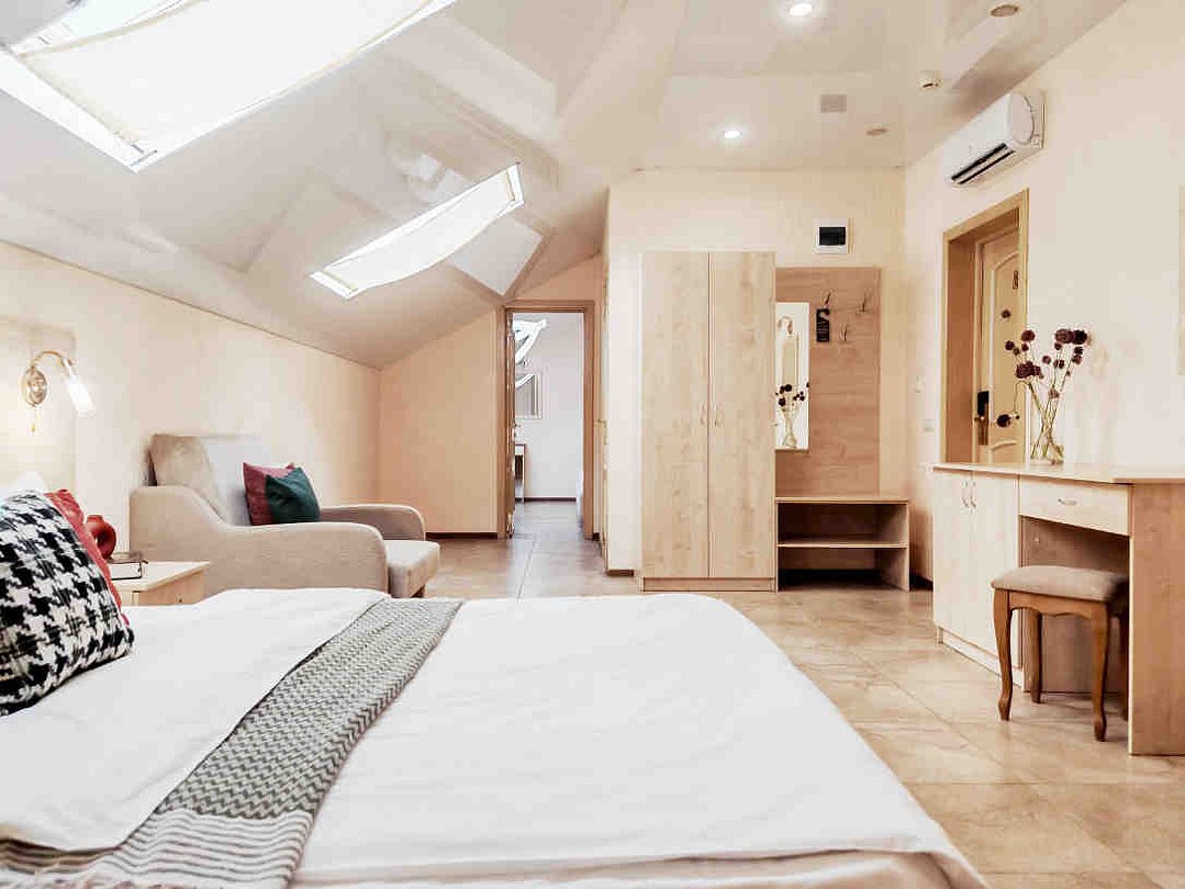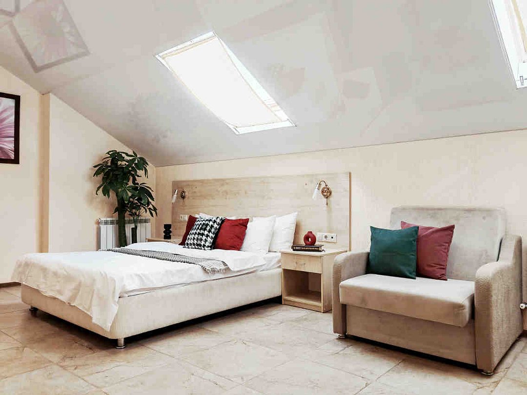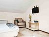 В номере: двуспальная кровать, два кресла-кровати, прикроватные тумбы, туалетный столик, пуфик, шкаф для одежды, мини-сейф, телевизор, сплит-система, мини-холодильник. Ванная комната с душевой кабиной, унитазом, раковиной, феном, жидким мылом, туалетной бумагой и полотенцами для каждого гостя. В номере мансардные окна.