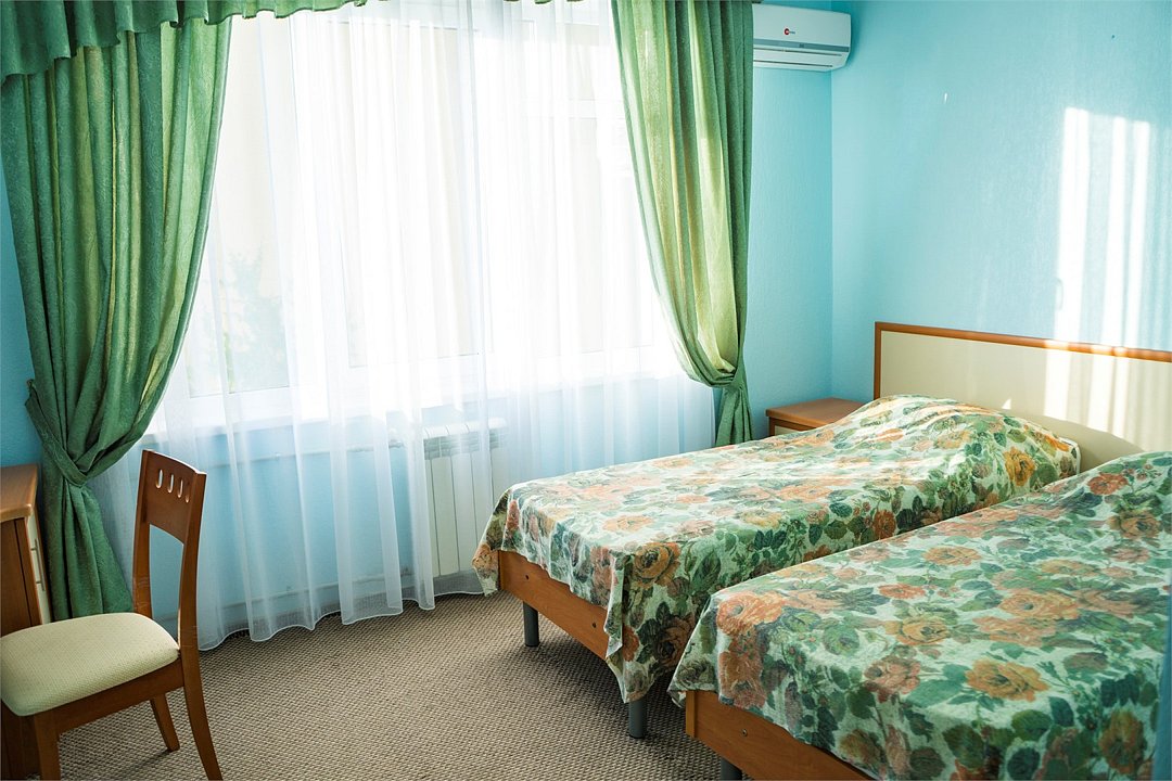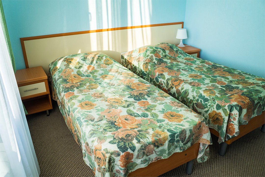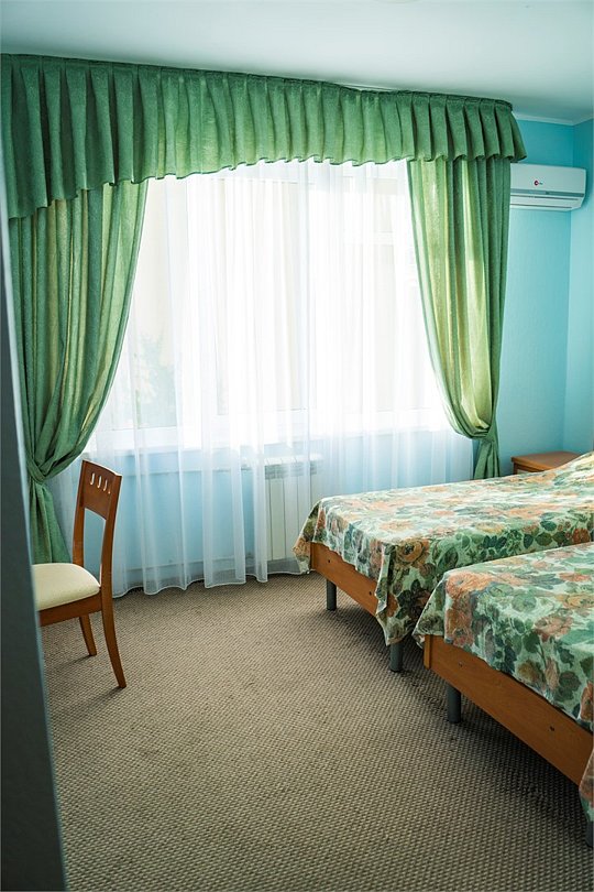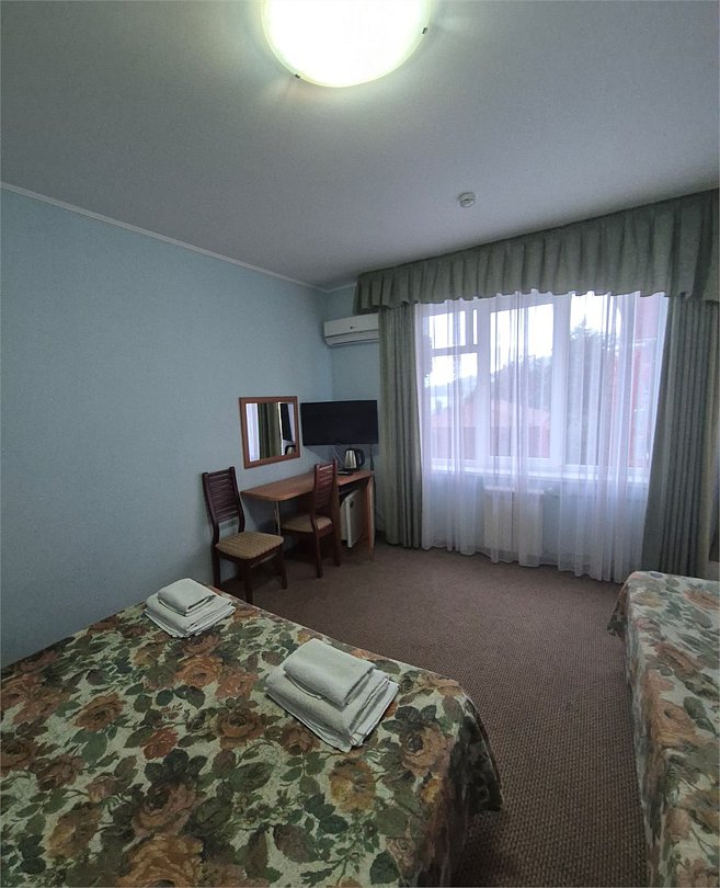 две односпальные кровати, шкаф для одежды, вешалки, зеркало, туалетный столик, затемняющая штора, зеркало в полный рост, без питомцевВ гостиничном номере
