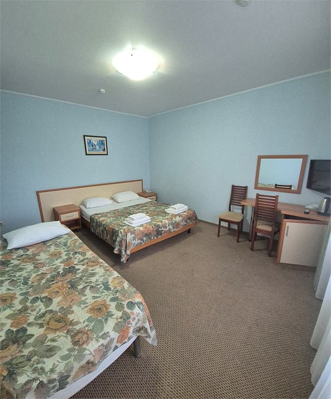 Трехместный номер с двуспальной и односпальной кроватями, балконом. Данная категория номера расположена на 2-3 этажах. В номерах есть чайник и минимальный набор посуды. В ванной комнате для комфортного проживания предоставляются косметические принадлежности (гель для душа, шампунь, мыло).Услуги и удобства