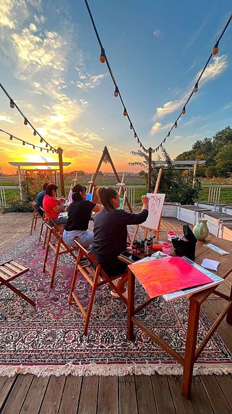 Выдаются одноразовые перчатки, фартук, краски, кисти и весь необходимый инструмент. На каждом мастер-классе вы разукрашиваете два скворечника, один с клеймом глэмпинга забираете домой, а второй вешается на деревья в глэмпинге.