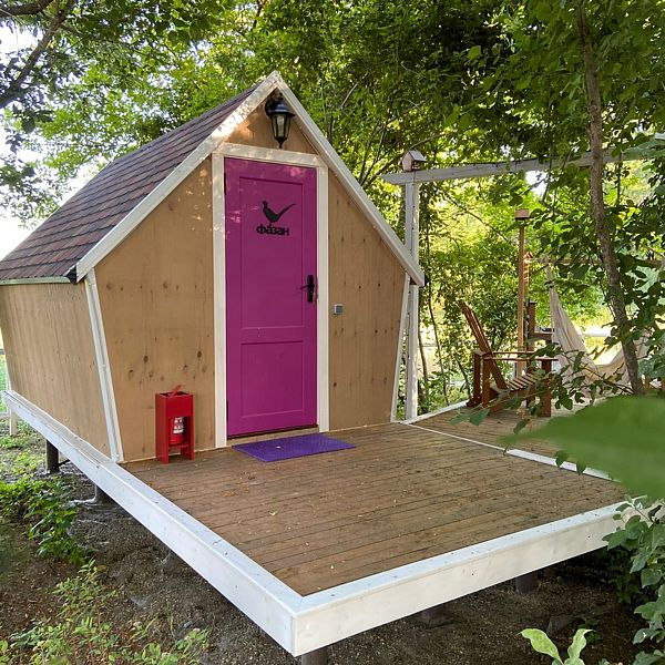 Большой гостевой дом находится на отдельном участке, в шаговой доступности от основной территории. Плюс такого размещения в том, что вы можете пользоваться абсолютно всем, что находится на территории глэмпинга, при этом другие гости доступа к территории вашего дома не имеют.