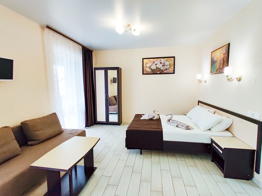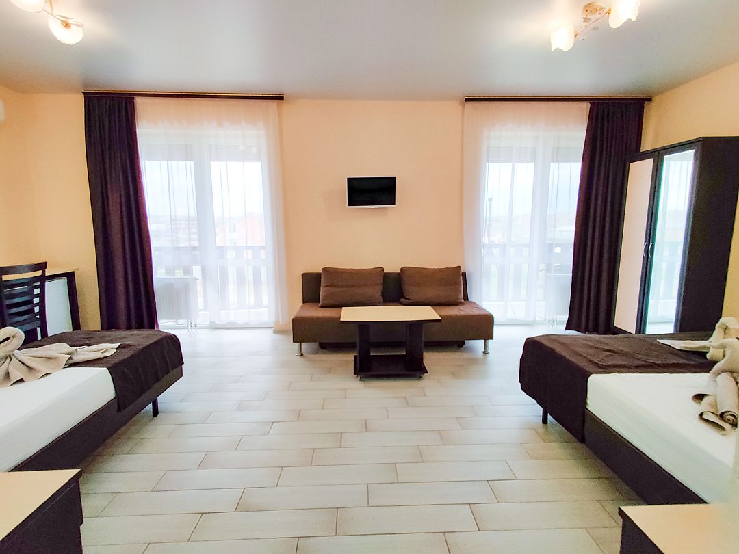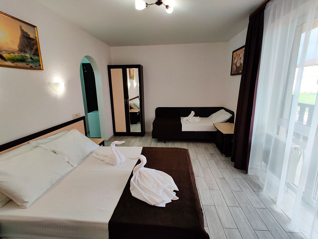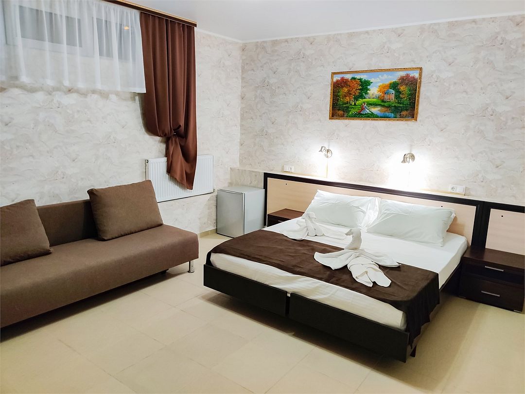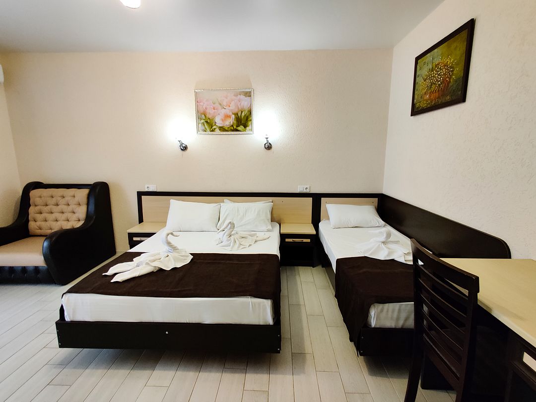 Просторный семейный номер с двумя балконами. Две односпальные, одна двуспальная кровать и полноценный диван-кровать. Ортопедические матрасы, белоснежное белье и полотенца, кондиционер.