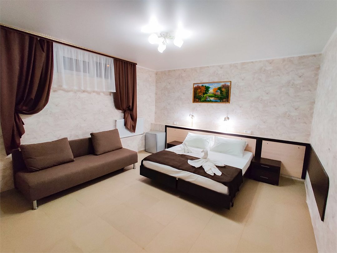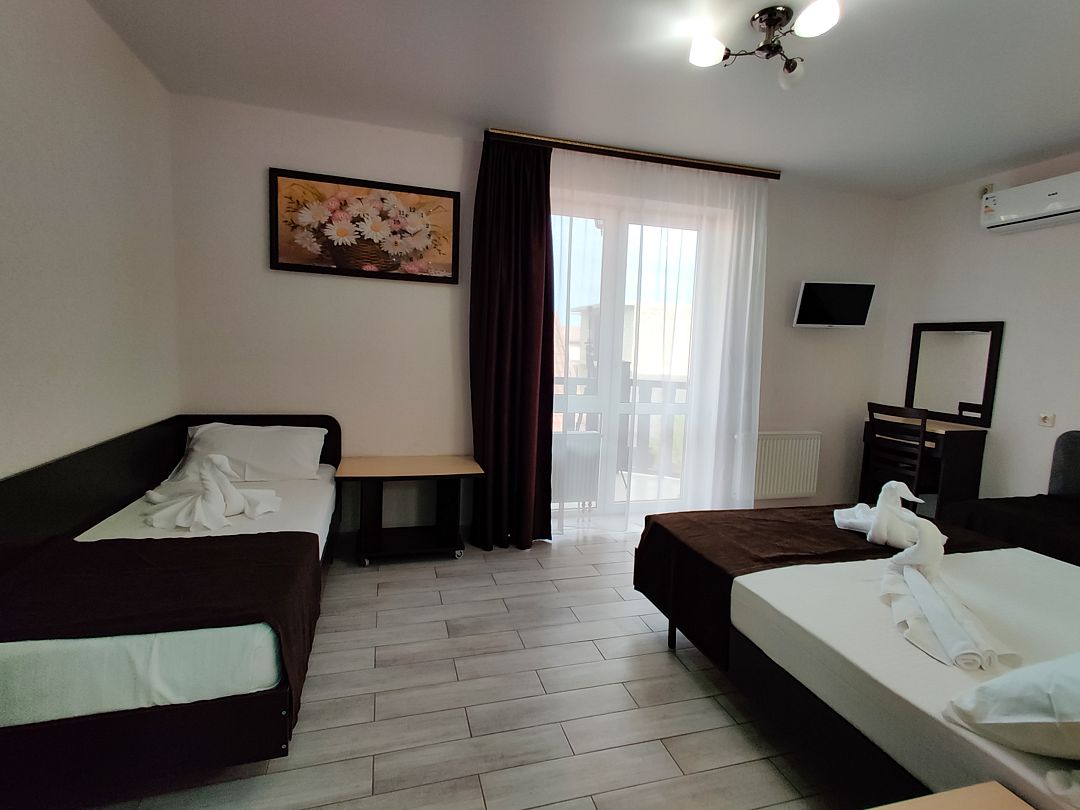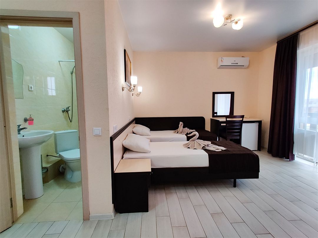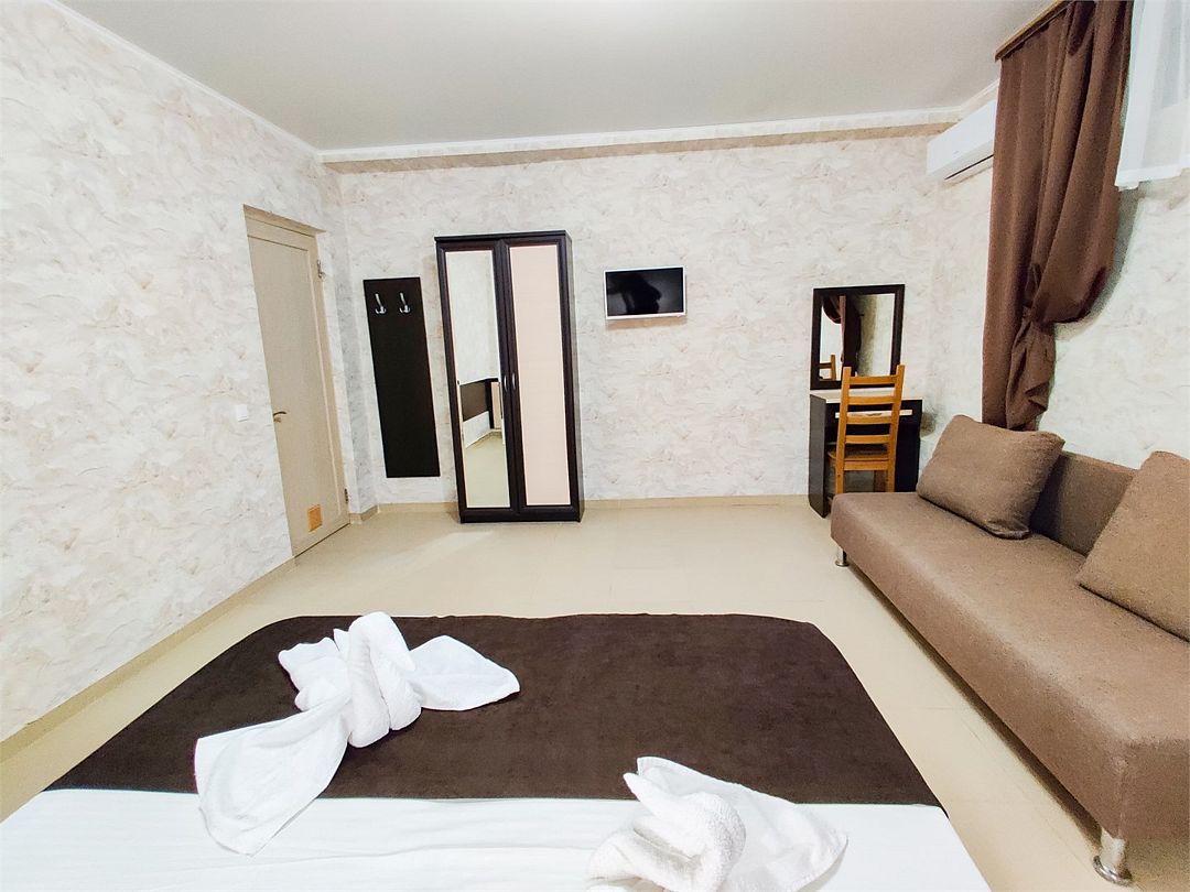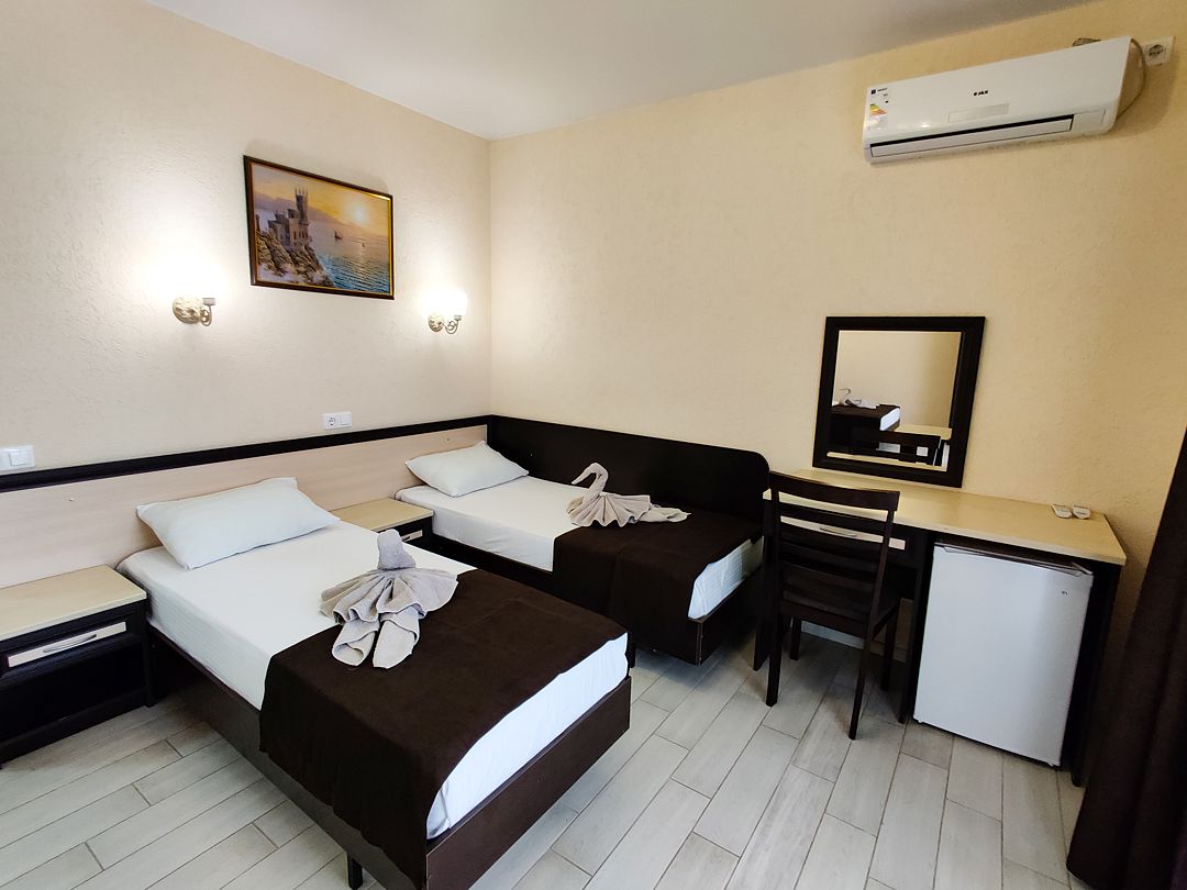 Светлый и удобный номер для трех-четырех человек. Двуспальная и односпальная кровати с ортопедическими матрасами, белоснежное белье, кондиционер.