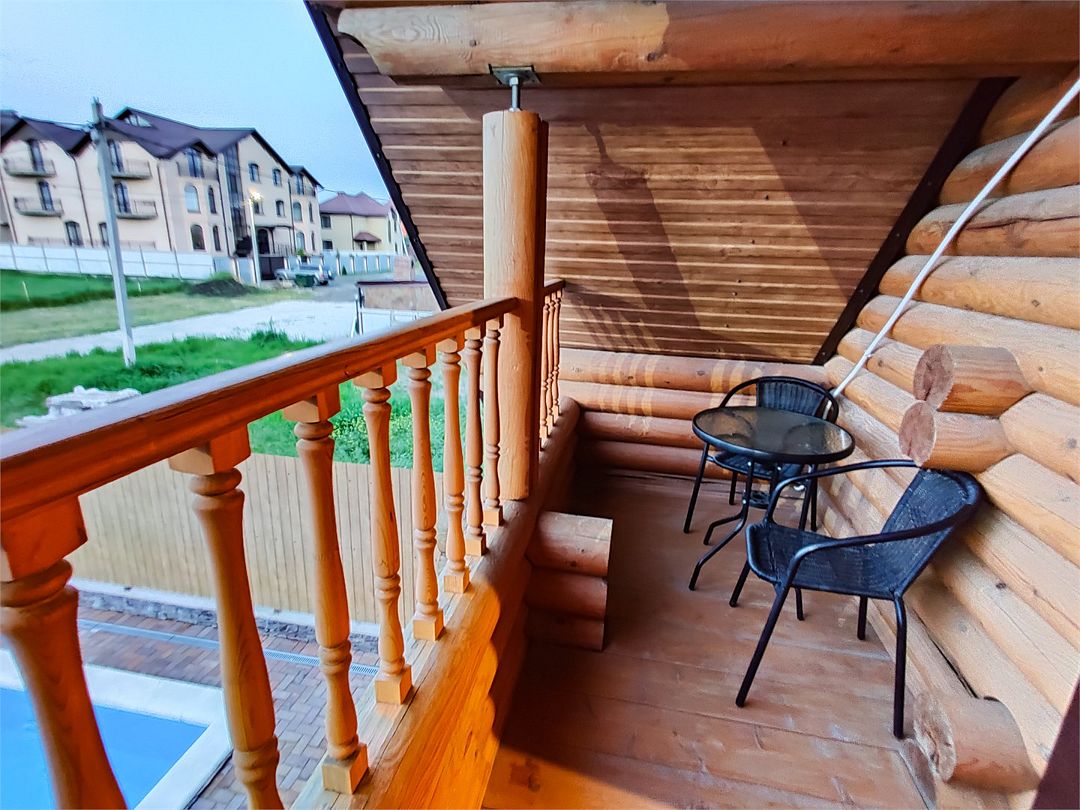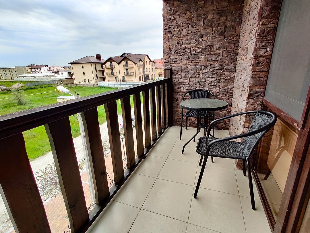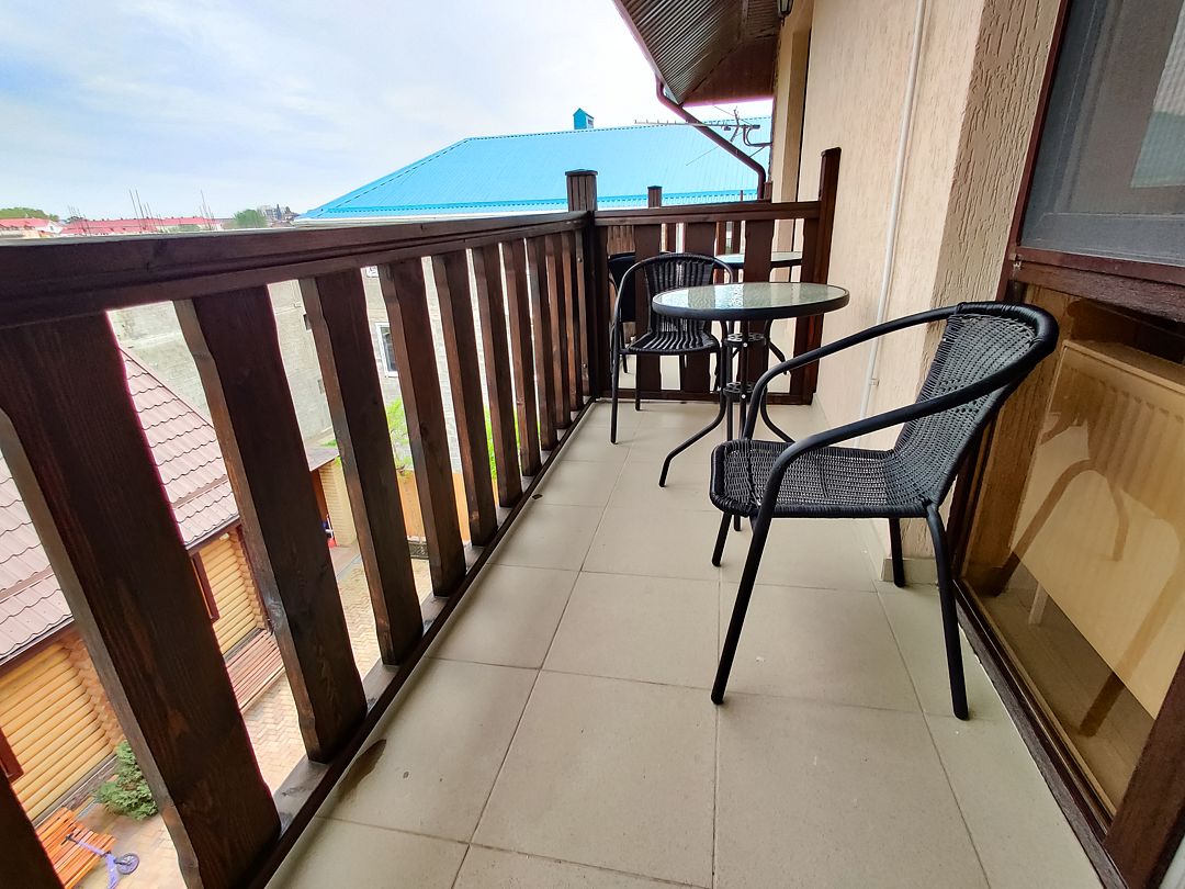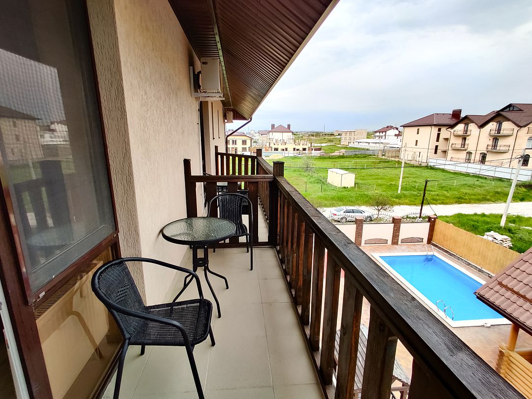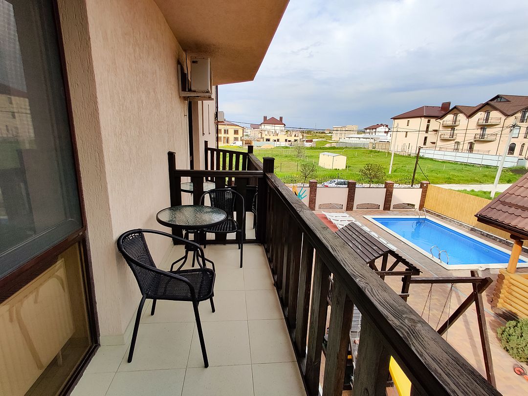 Балкон со столиком — вид во двор на бассейн или улицу. Дополнительно есть удобная кресло-кровать для ребенка пяти-семнадцати лет.