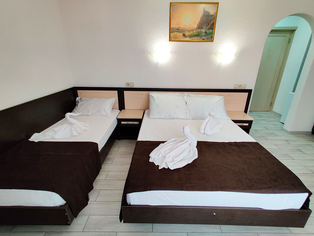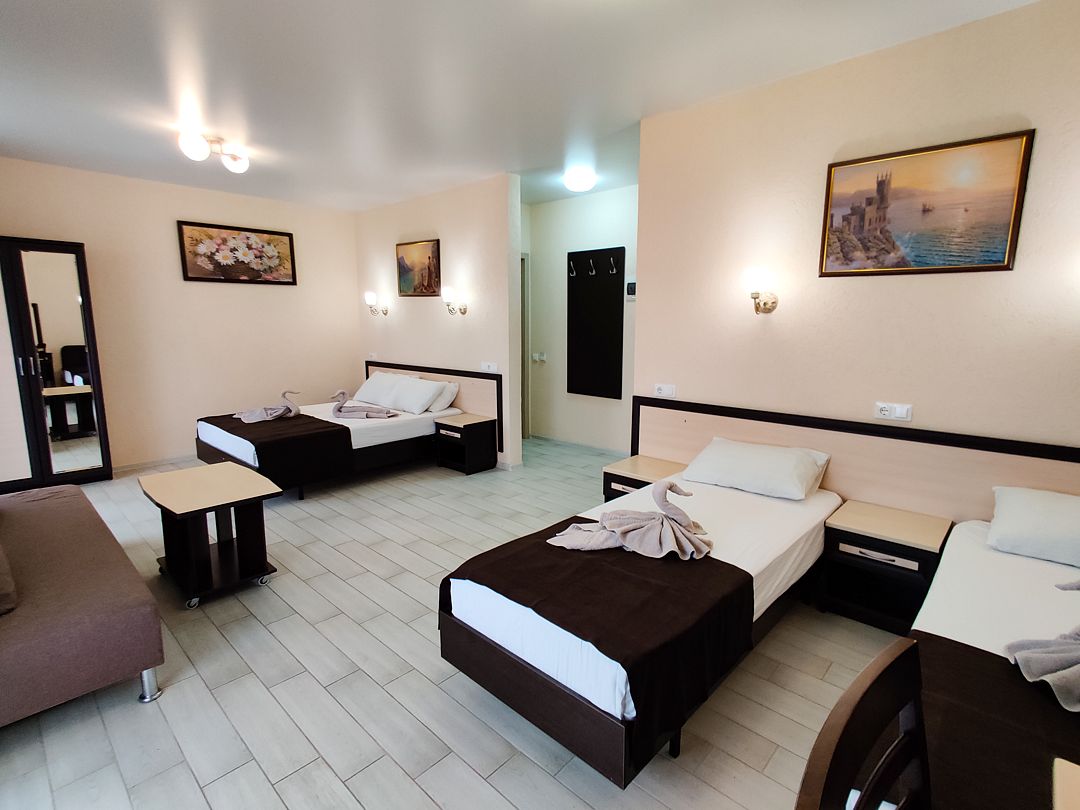 Четырехместный номер с двуспальной и двумя односпальными кроватями. Кондиционер, ортопедические матрасы, белоснежное белье, мягкий свет.