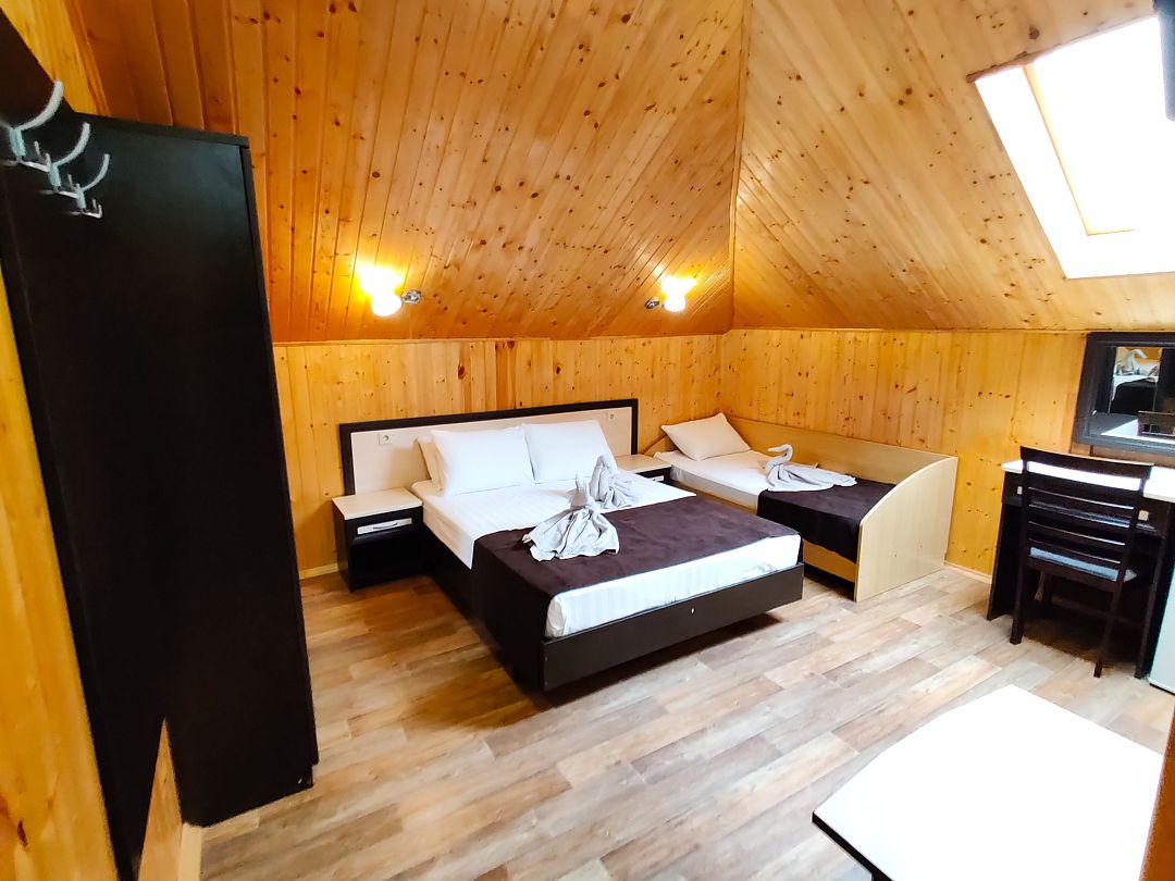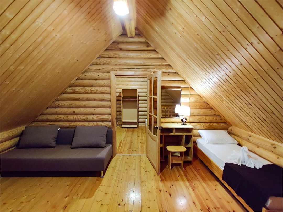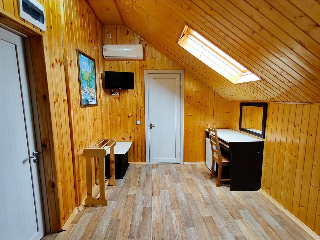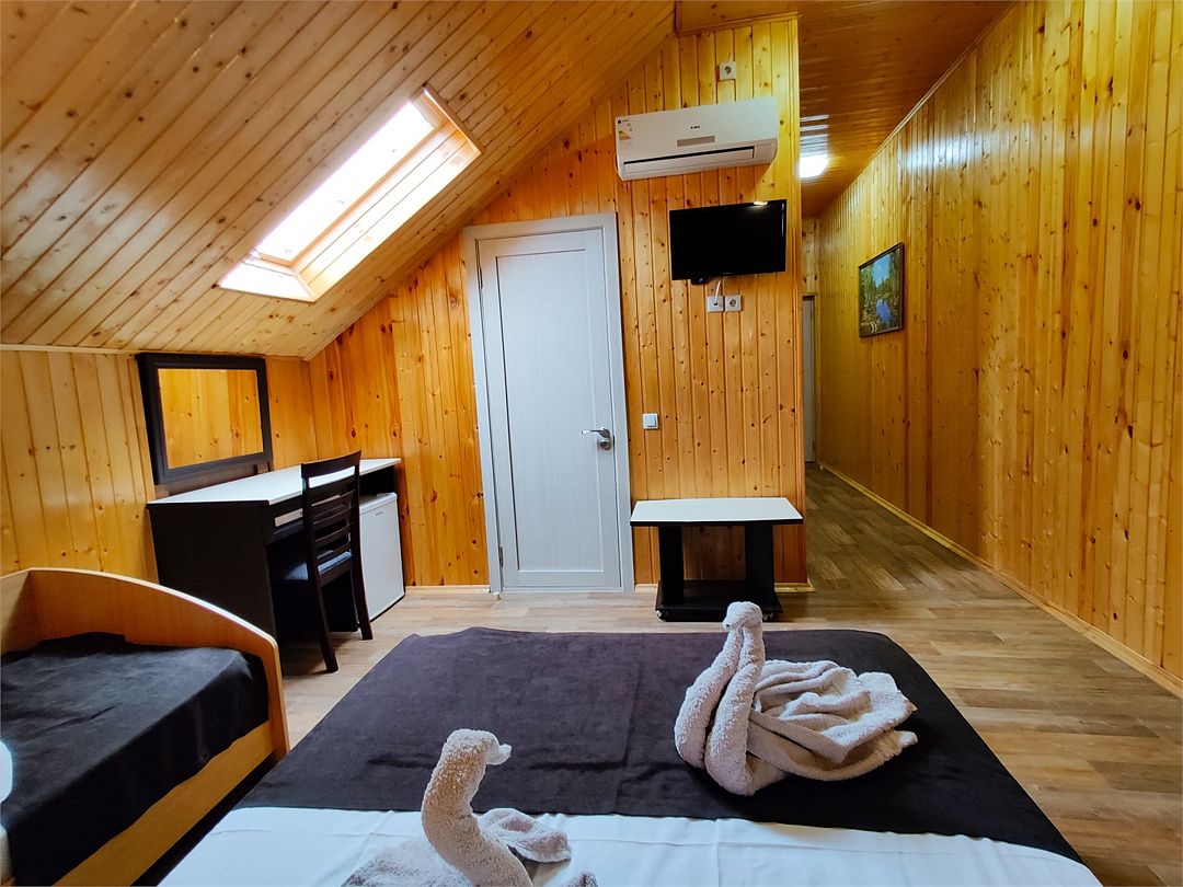 Трехместный светлый номер с отделкой деревом. Оснащен кроватями с ортопедическими матрасами, белоснежным постельным бельем и всеми удобствами.