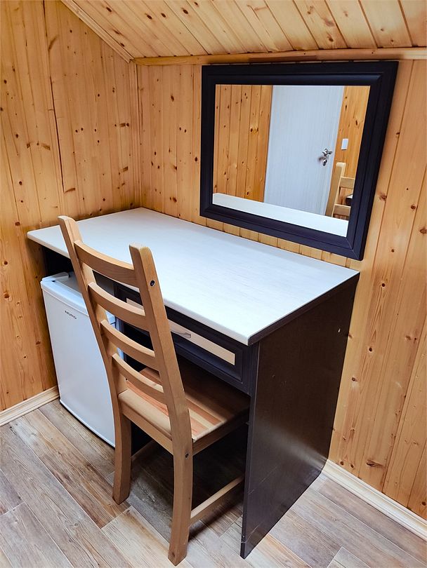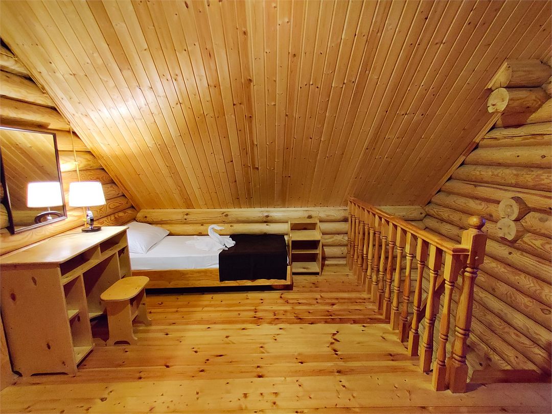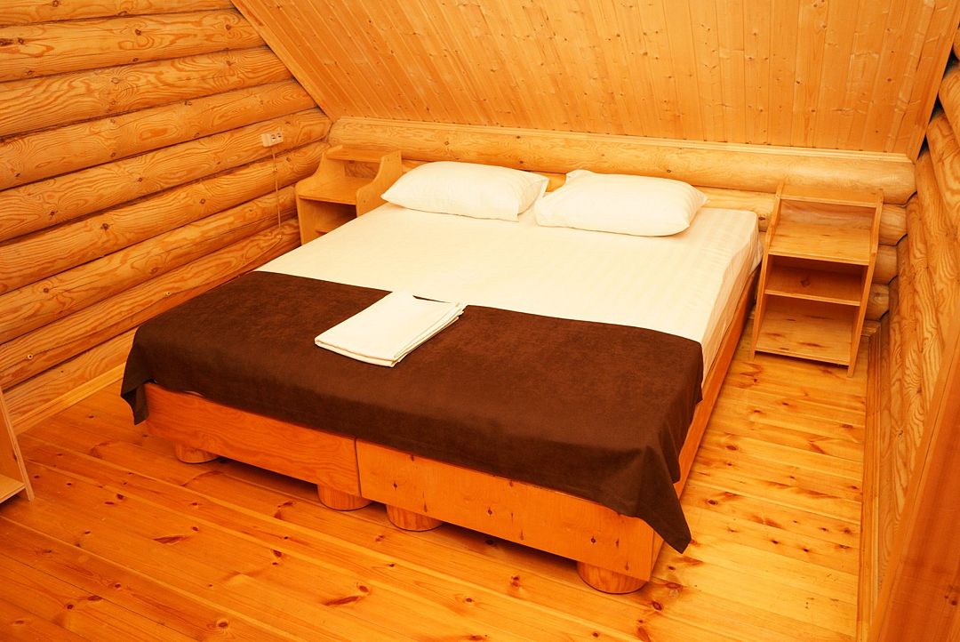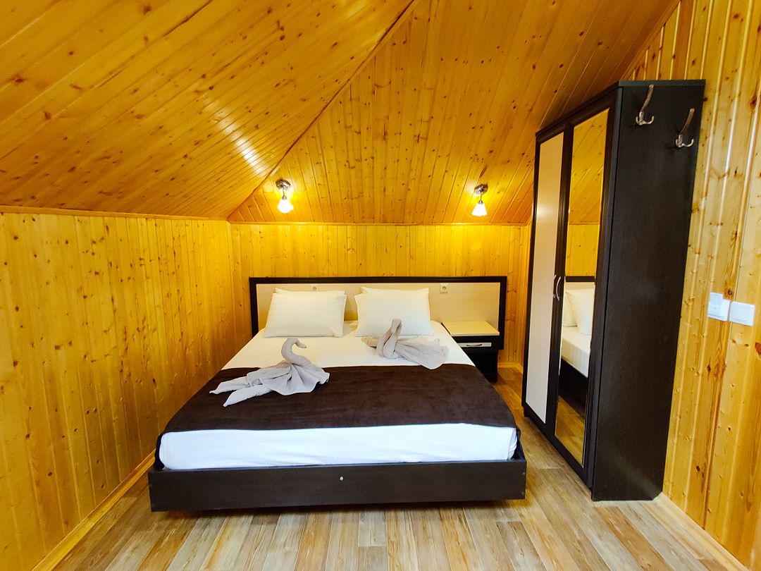 Двухместный светлый номер с отделкой деревом. Двуспальная кровать с ортопедическим матрасом, белоснежное постельное белье и все базовые удобства.