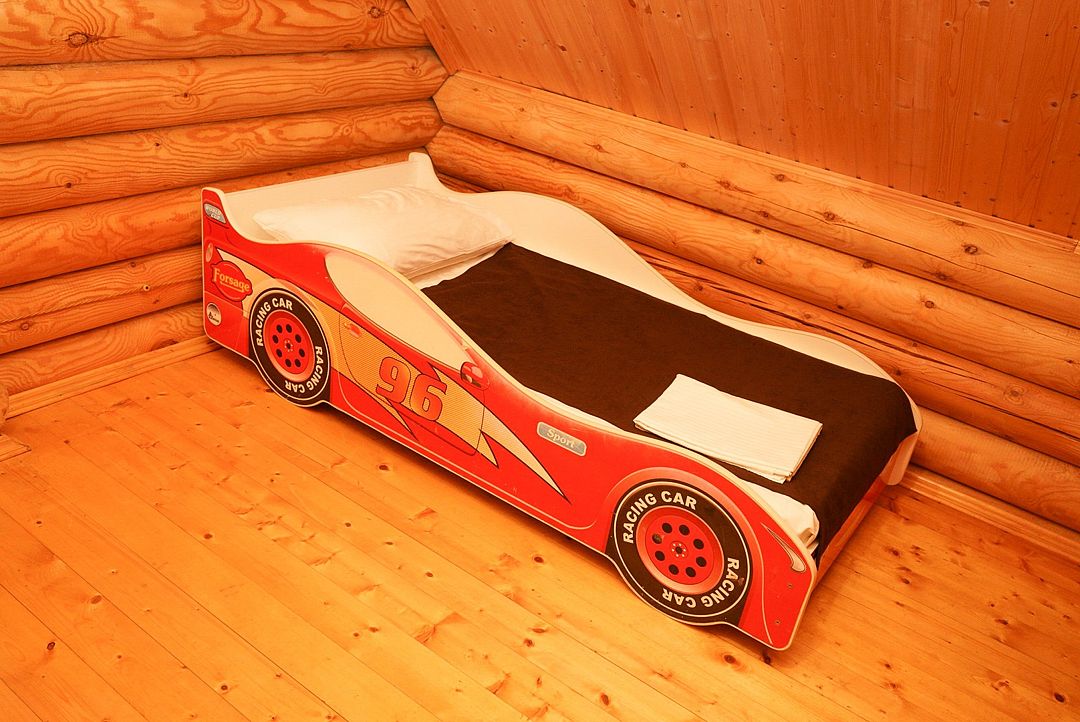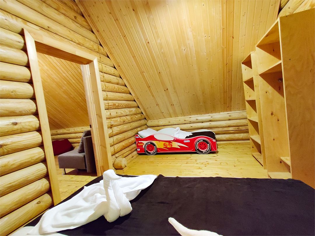 Уютный двухэтажный дом-шале для большой семьи. Большая и односпальная кровати, диван и детская кроватка — пространство, где каждому комфортно.