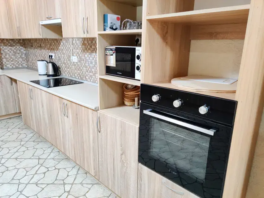 Кухня со всем необходимым, как дома. За домом — площадка барбекю. С террасы и балкона открывается вид на бассейн. По утрам — солнце в чашке, по вечерам — шаг, и вы у воды.