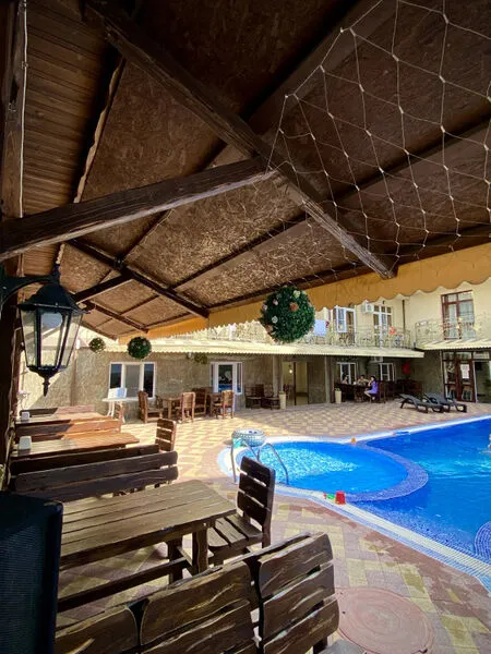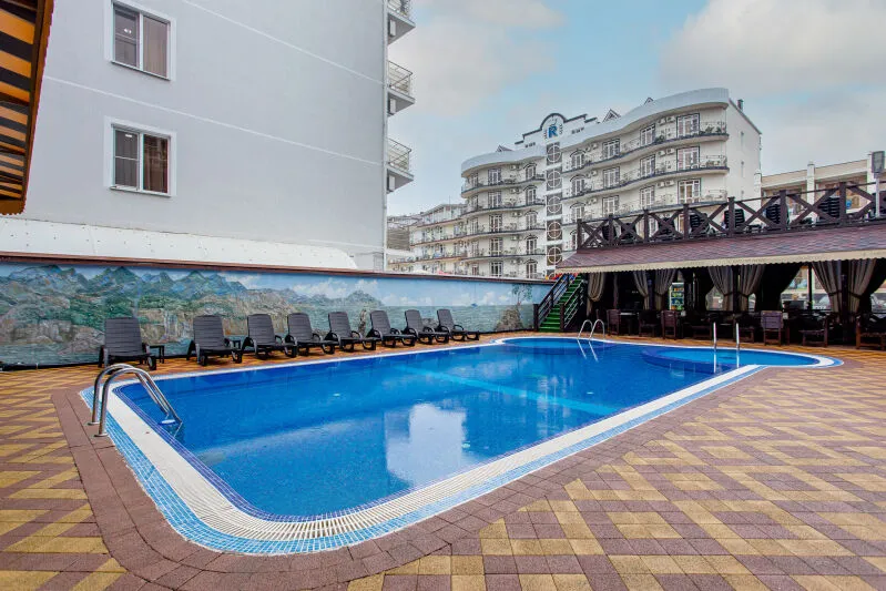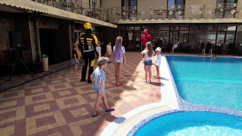 Бассейн оборудован по всем нормам безопасности. Для самых юных гостей создана специальная детская зона для купания. У бассейна организована профессиональная анимация для взрослых и детей.