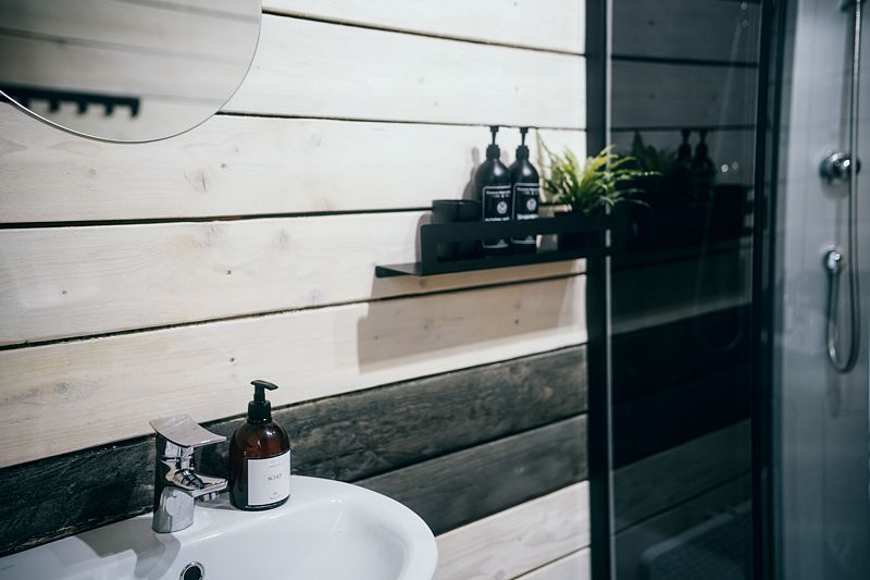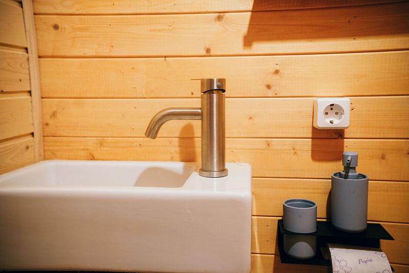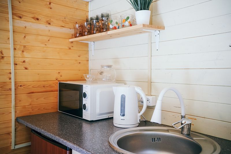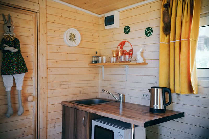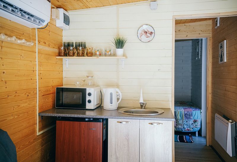 В домике есть всё необходимое для проживания: кухня, собственная ванная комната.