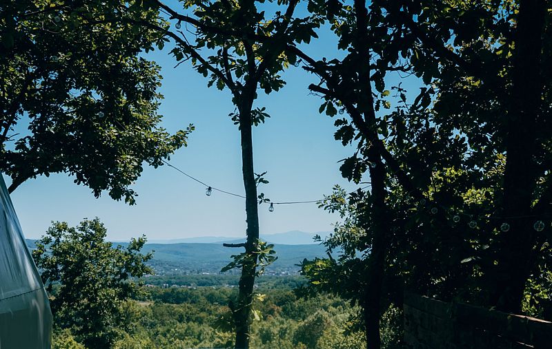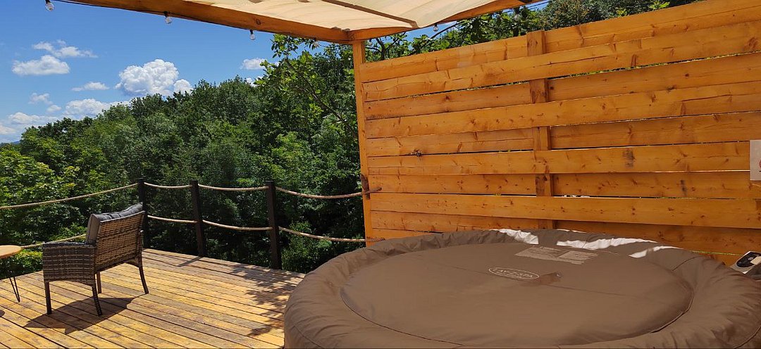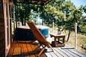У сферы есть собственная деревянная терраса с видом на горы и лес, креслами кентукки, мангальной зоной.