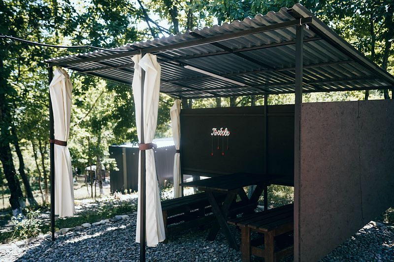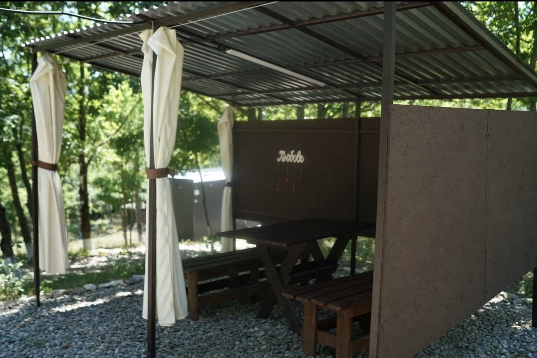 В домике есть всё необходимое для проживания: кухня, собственная ванная комната, беседка, мангальная зона.