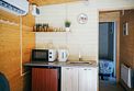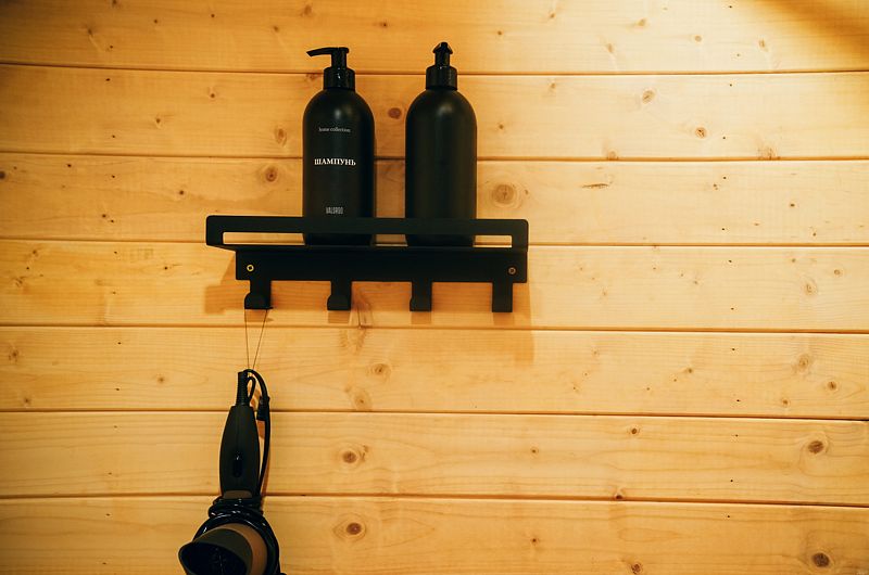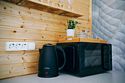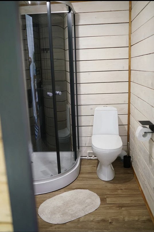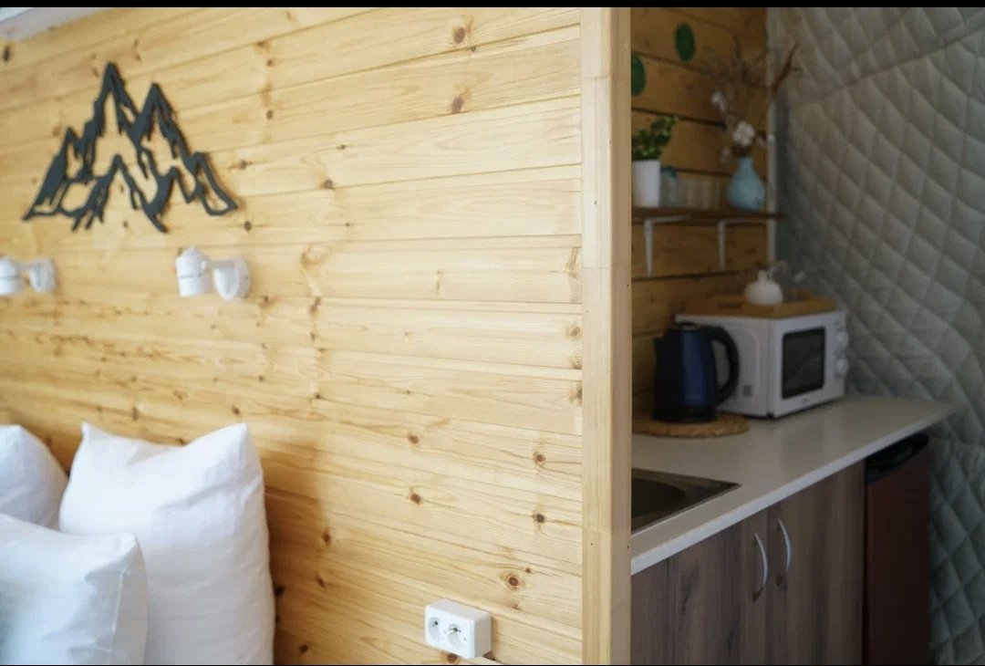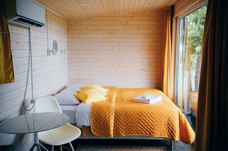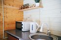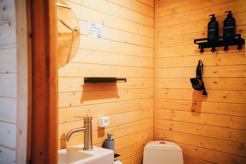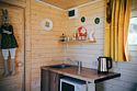 В домике есть всё необходимое для комфортного проживания: кухня, ванная комната, двухспальная кровать.