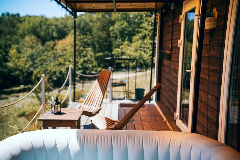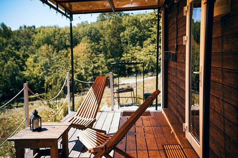 • Терраса: Индивидуальная зона отдыха с панорамным видом на лес и горы.